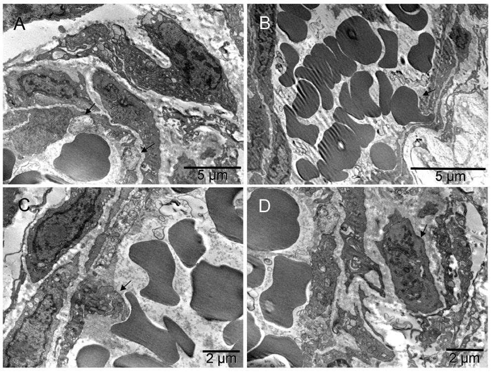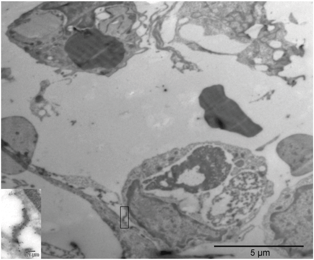 In those more differentiated cells beneath the hyaline membrane, the calmyrin-specific label formed clusters over an area of about caveolar size, i.e. 70 nm in diameter (Figure 8 & Figure S8) revealing a new ultrastructural element, the calmyrite. The sub-cellular location of the calmyrites in mitochondria, peroxisomes and erythrosomes, suggested that all three of those organelles were homing previously unreported ultrastructural elements related to energy metabolism. In addition to cell types shown in Figure 8 & Figure S8 [A-H], calmyrites were seen in megakaryocytes, platelets, granulocytes, plasma cells, smooth muscle and rat normal EC(s). The included rat lung section (Figure 8 [I]) demonstrated that calmyrites existed in normal differentiated cells together with mitochondria and were not a product of necrotic process, but rather representing a backup metabolic pathway rendering robustness to the cellular metabolism.