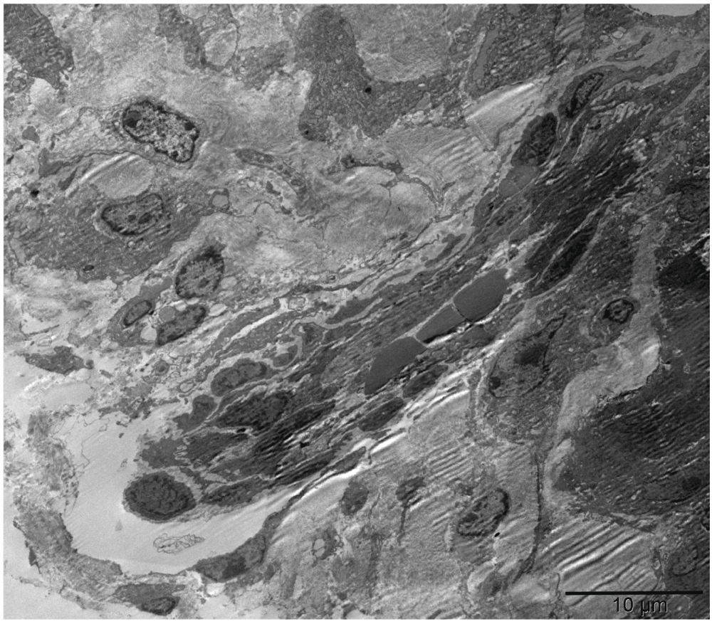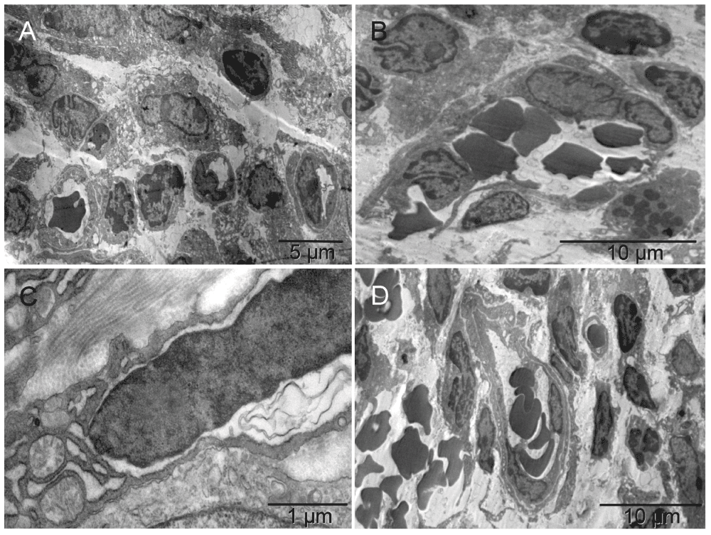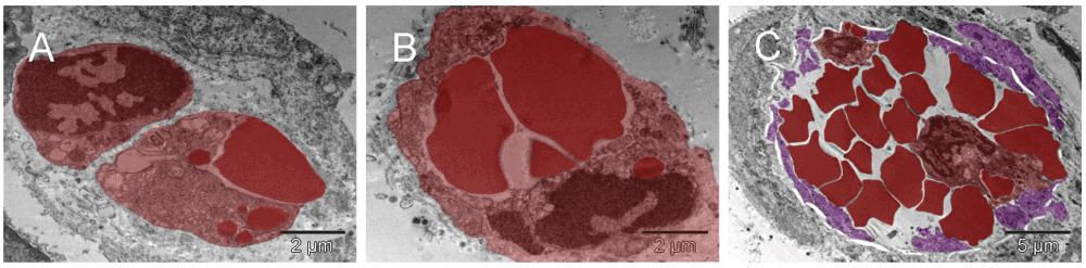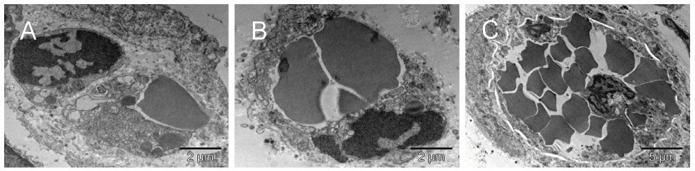 Three weeks after implantation, some cells kept converting into the erythrosomes and others kept providing structural support to them but in a more complex way. Their phenotypes kept changing (Figure 9 & Figure S9). Some cells were producing large amounts of collagen as if converting their entire cytoplasm into masses of collagen while their nuclei were converting into erythroschizosomes (Figure 9 & Figure S9 [C]) leading to a new tissue canvas in the form of fields of collagen with erythrosomes scattered in there. Such vessel-free erythrosomes described earlier in a similar context were believed to be extravasated erythrocytes. Eosinophils, adipocytes and dendritic cells were occasionally present in that environment as well. Erythrosomes and cells providing structural support to them seemed to have been chemotacticly attracted to each other regardless of the current level of their differentiation. Moreover, segments of new vasculature with increasing structural complexity were assembling around emerging erythrosomes into capillaries and vessels of variable size simultaneously. Occasionally, megakaryocyte-resembling cells were positioning themselves like pericytes, i.e. abluminally, close to a forming vessel. The one in Figure 9 & Figure S9 [B] might have been a megakaryocyte evolving into ECs or pericyte. Still greater complexity of the vasculature morphogenesis was evident in the second mouse with tumor grown for three weeks. D epending on the location in the section, the more primitive forms of the vasculature were present as well. Collagen came across as an important factor for building not only vasculature but also tumor tissue (Figure 10 & Figure S10). Signs of hypoxic stress were in the form of relatively small darkening or necrotic mitochondria (loosing their internal structure) and dilated cisternae of endoplasmic reticulum (ER) partially depleted of ribosomes and resembling vesiculo-vacuolar organelles (VVOs)59, (Figure 10 & Figure S10 [D]).