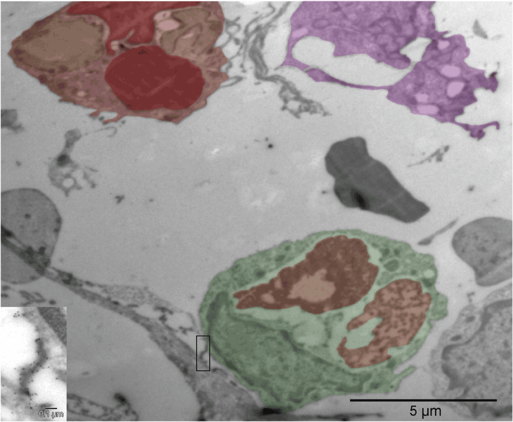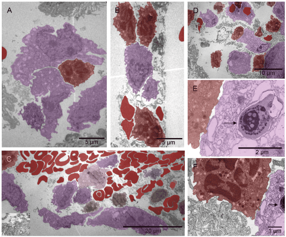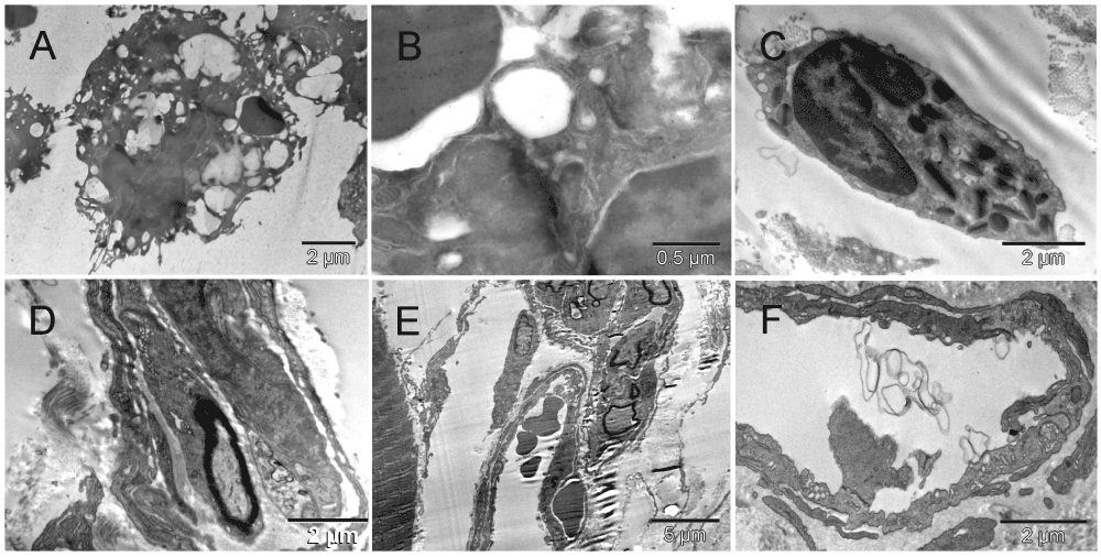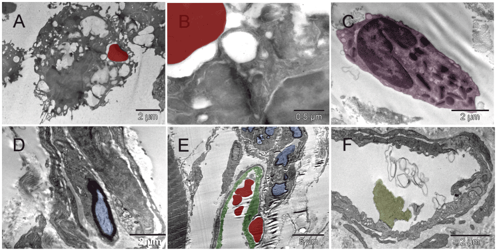 [A & B]: Erythrosome labeled with ubiquitin-detecting antibody, internalized by non-labeled macrophage (Mouse 5). [C]: Eosinophil (Mouse 3). [D]: Myelinated nerve fiber engulfed by Schwann cell (Mouse 2). [E]: Forming vessel located between muscle and nerves (Mouse 2). [F]: Empty vein or lymphatic vessel with an internal valve (Mouse 2).