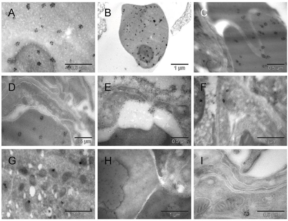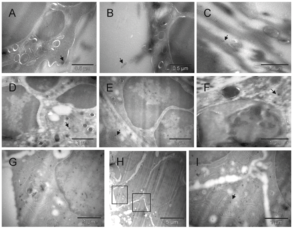 Clusters of the gold label were found on the cell surface, in the nucleus, cytoplasm and mitochondria of cells morphologically fitting the description of erythroblasts [A, B, D & E] and on extracellular collagen fibers produced by them [B & C]. A fragment of cell with mixed phenotype is shown in [F]. The cluster of CD34-labeled giant erythroblasts (potentially leading to myeloplaxes) contained one cell with a double nucleus (right side in [H]). Two regions of [H] are enlarged in [G & I], left and right respectively, to show oversized mitochondria, some converting into peroxisomes [G]. That cluster of cells was bigger than the one shown earlier (Figure 3C), and the presence of mitochondria despite clear commitment to erythrogenesis suggested that here the process was more efficient. Arrows point out some clusters of Au grains.