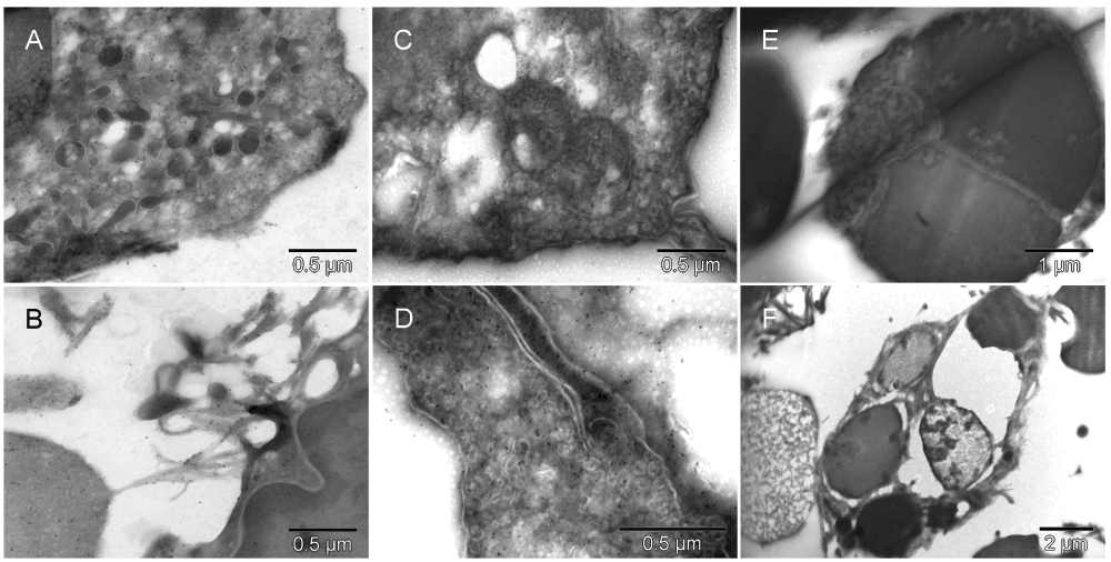 GFP-specific label was present in erythroblasts [A], primitive erythrosomes like the one separating from the cell that made it (left lower corner in [B]), platelets [C] and in EC [D]. Morphologically interesting cells, erythroblast [E] and perishing hemangioblast [F], stained with nonspecific antibody are shown at low magnification (they had no gold grains). The erythroblast was entirely consumed by a successful incremental conversion into at least three erythropoietic vesicles [E] and the cell with ambivalent phenotype [F], possibly hemangioblast, contained three internal vesicles resembling erythrosomes and two of comparable size that appeared to be failing as erythrosomes (partially electron lucent ones).