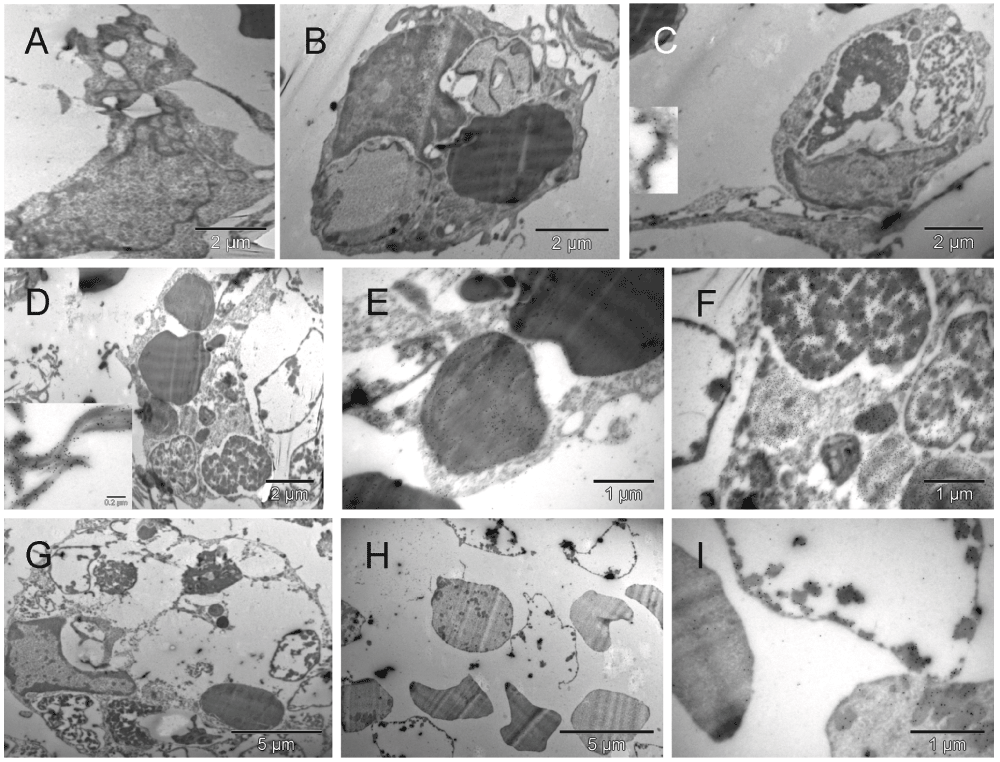The cells shown in the upper row [A, B & C] were located in the hyaline membrane 5 µm (or less) apart from one another (Figure 7 & Figure S7) suggesting their relatively recent derivation from a common precursor. The first, irregularly shaped cell with platelet-resembling attachment was probably a megakaryocyte [A]. The second one, had four large vesicles but only one of them was similar in size and electron density to a cell-free erythrosome (right upper corner in [A] and elswhere), whereas two other vesicles were much lighter with the exception of small patches at the periphery, and the fourth one was probably an incompletely converted nucleus [B]. The third cell had two large vesicles and both appeared to represent different stages of degradation of the material they were made of [C]. The outer membrane of that cell was at one side connected to another cell via calmyrin-containing extracellular fibers (insert in [C]). Both cells with the large vesicles made impression of cells with mixed phenotypes with some inclinations to specialize in either producing erythrosomes [B] or forming a lumen [C]. Fields shown in [D–I] were in the same section; they represented what seemed to be left after internal remodeling of polyploidal cells or multi-cellular clusters [D & G]. There were cell-free erythrosomes as well as empty vesicles, some broken [H]. Clearly, cells were perishing because of such restructuring but they were also changing the microenvironment. Insert in [D] shows calmyrin-specific label on fibers of ECM. [E, F & I] are enlarged regions from [D] and [H], respectively.