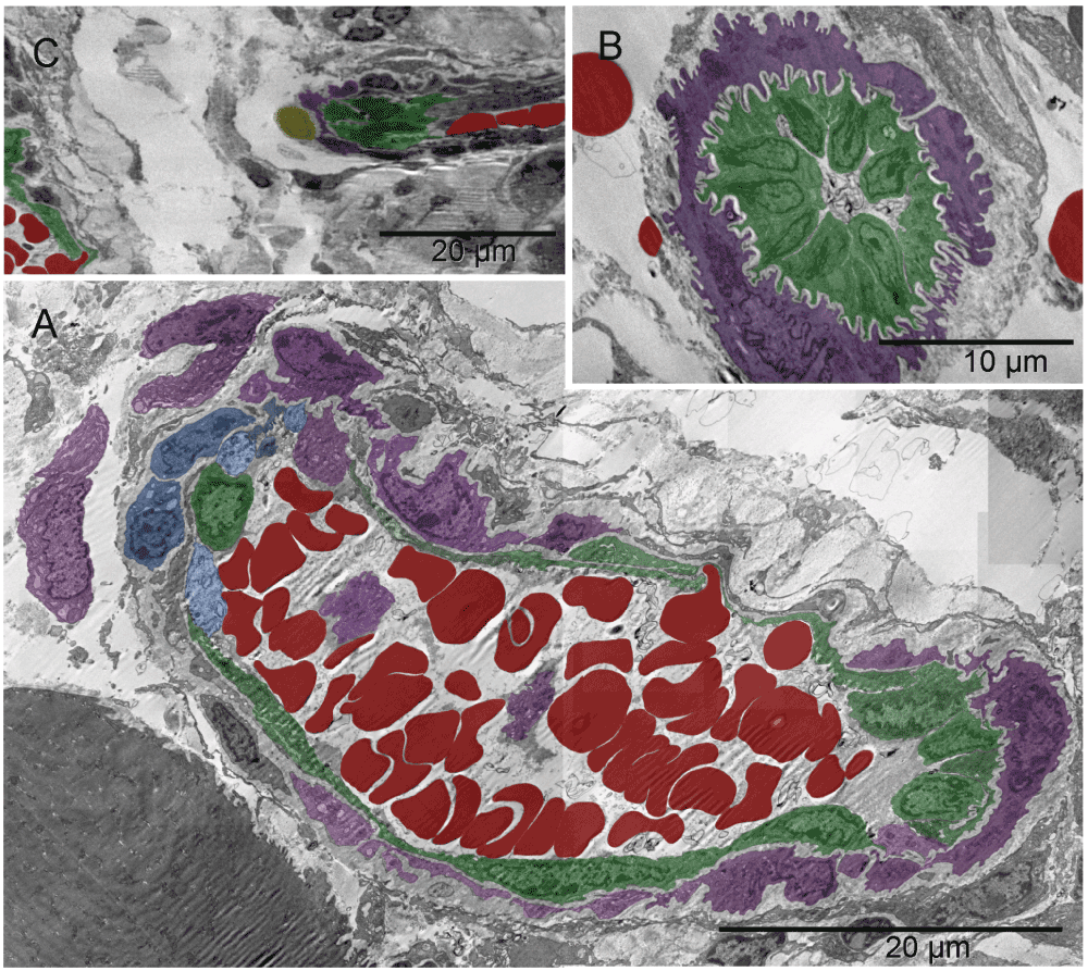 Forming lumen of the emerging vasculature fragment shown in [A] was occupied by free erythrosomes (red) and platelets (purple). That “vasculature piece” was not a vessel yet because it included blood elements that were being generated simultaneously with the vessel wall. The wall was incomplete at the time of image capturing. Structural differences along the circumference of the future lumen included a gap on the left side. Such lack of continuity and the irregular forms of erythrosomes also indicated that the forming vessel was not yet a part of the circulation. In that region, cells other than endothelial cells were recognizable, namely nerve and chromaffin cells (dark and light blue, respectively) and megakaryocytes (purple) at the outer side; although their products, platelets (purple), accompanied the erythrosomes in the lumen. The right side of the vessel wall was structurally the most advanced; it consisted of ECs (green) uncharacteristically non-flattened. The shape of their nuclei and corrugation of the basement membrane between those cells and supporting pericyte suggested a potential for physical expansion. Such wavy basement membrane likely contained elastic fibers. The image in [B] could have been from a similar region cut in a perpendicular plane with regard to that in [A]; nuclei of the centrally located ECs had their radial sinuses oriented towards the basement membrane. That too could facilitate the expansion of the vessel. ECs in the middle part of the main image [A] were flattened; in the upper side one could see an erythrosome passing through. The spatial relationship between the structures shown in [A] and in Figure S10 is demonstrated in [C].