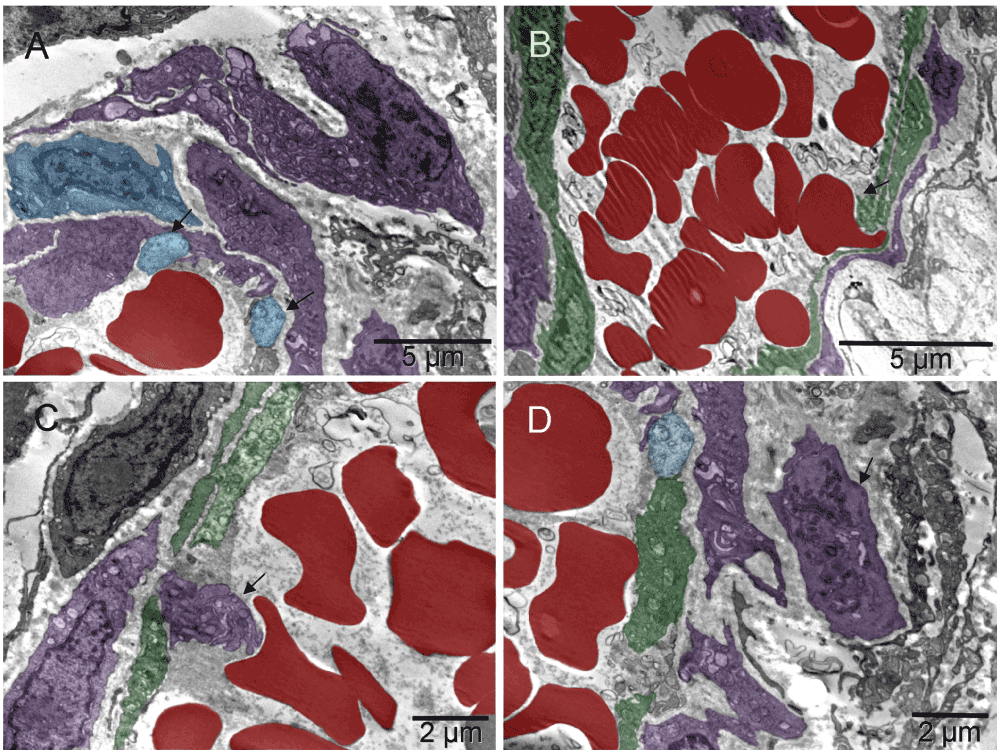 The images were from a section parallel to the one shown in Figure S8, i.e., from another region of the same vessel. Arrows point to two chromaffin cells (blue) in [A]; erythrosome (red), platelets (purple) and maturing platelets “ante portem” i.e. facing the opening in the endothelium (green), are shown in [B,C & D], respectively.
