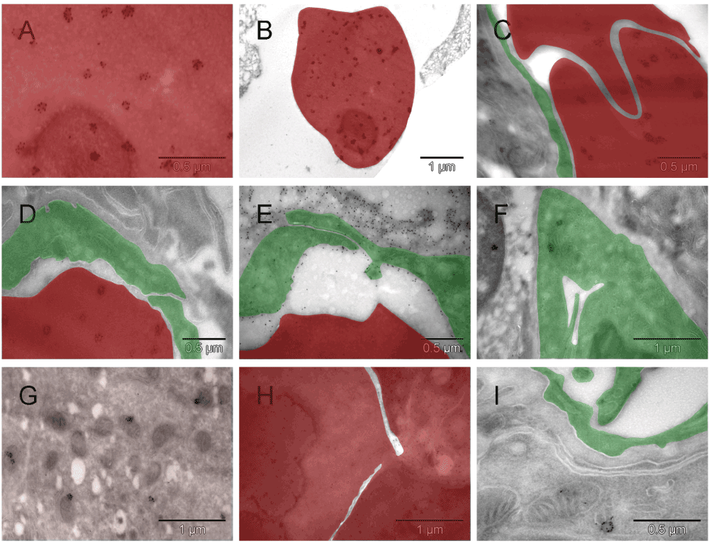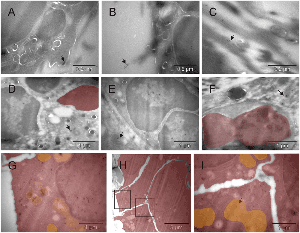 Clusters of the gold label were found on the cell surface, in the nucleus, cytoplasm and mitochondria of cells morphologically fitting the description of erythroblasts [A, B, D & E] and on extracellular collagen fibers produced by them [B & C]. A fragment of cell with mixed phenotype is shown in [F]. The cluster of CD34-labeled giant erythroblasts (red), potentially leading to myeloplaxes, contained one cell with a double nucleus (right side in [H]). Two regions of [H] are enlarged in [G & I], left and right respectively, to show oversized mitochondria (orange), some converting into peroxisomes (dark & orange) [G]. That cluster of cells was bigger than the one shown earlier (Figure S3C), and the presence of mitochondria despite clear commitment to erythropoiesis suggested that here the process was more efficient. Arrows point out some clusters of Au grains.