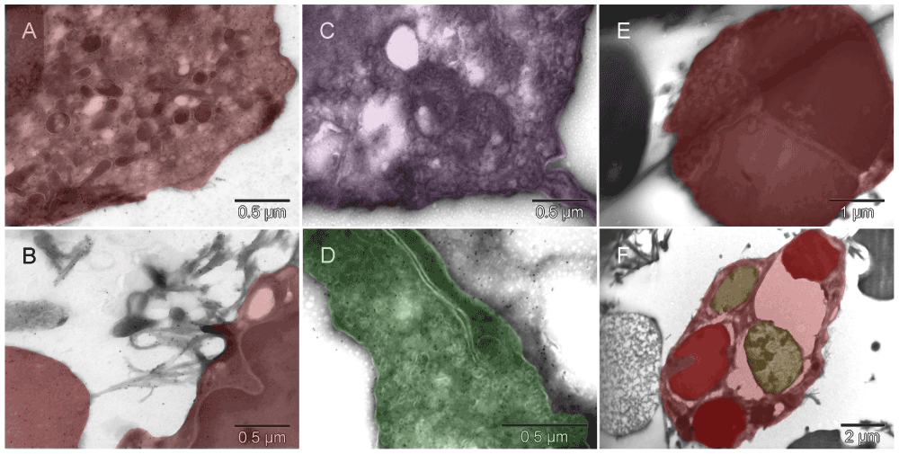 GFP-specific label was present in erythroblasts (red) [A], primitive erythrosomes (red) like the one separating from the cell that made it (left lower corner in [B]), platelets (purple) [C] and in EC (green) [D]. Morphologically interesting cells, erythroblast [E] and perishing hemangioblast [F] stained with nonspecific antibody are shown at low magnification (they had no gold grains). The erythroblast was entirely consumed by a successful incremental conversion into at least three erythrogenic vesicles (red) [E] and the cell with ambivalent phenotype [F], possibly hemangioblast, contained three internal vesicles resembling erythrosomes (red) and two of comparable size that appeared to be failing as erythrosomes (green) (partially electron lucent ones).