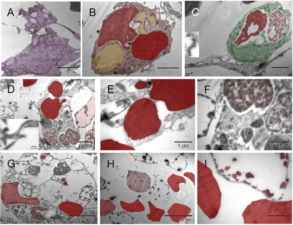 The cells shown in the upper row [A, B & C] were located in the hyaline membrane 5 µm (or less) apart from one another (Figure S14b) suggesting their relatively recent derivation from a common precursor. The first, irregularly shaped cell with platelet-resembling attachment was probably a megakaryocyte (purple) [A]. The second one (mixed shades of red), had four large vesicles but only one of them was similar in size and electron density to a cell-free erythrosome (right upper corner in [A]), whereas two other vesicles (yellow) were much lighter with the exception of small patches at the periphery, and the fourth one was probably an incompletely converted nucleus [B]. The third cell (green) had two large vesicles (red and pink) and both appeared to represent different stages of degradation of the material they were made of [C]. The outer membrane of that cell was at one side connected to another cell via calmyrin-containing extracellular fibers (insert in [C]). Both cells with the large vesicles made impression of cells with mixed phenotypes with some inclinations to specialize in either producing erythrosomes [B] or forming a lumen [C]. Fields shown in [D & I] were in the same section; they represented what seemed to be left after internal remodeling of polyploidal cells or multi-cellular clusters [D & G]. There were cell-free erythrosomes as well as empty vesicles, some broken [H]. Clearly, cells were perishing because of such restructuring but they were also changing the microenvironment. Insert in [D] shows calmyrin-specific label on fibers of ECM. [E, F & I] are enlarged regions from [D] and [H], respectively.