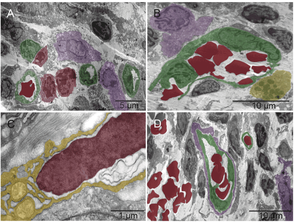 The goal of our study was to visualize the cellular mechanisms of vasculature formation associated with the growth of malignant tissue. We carried out the ultrastructural in situ analysis of initially avascular breast tumor spheroids co-implanted with homologous tissue graft, into the mouse dorsal skin folds44,45. A complementary study on such spheroids implanted without the graft is the subject of a separate report43. In contrast to the reductionism that dominated the ultrastructural studies of the second half of the last century, we analyzed tissue sections instead of isolated tissue components. The high resolution was necessary to investigate distinct physiology and functions of individual cells whereas the tissue context unveiled interactions among the cells. The results revealed interdependence between erythrogenesis and vasculogenesis localized at the site of tissue growth or repair and other new qualities of the emerging system. The data illustrated a great variability and increasing complexity of the vasculature morphogenesis, i.e., formation of blood and vessels, as both were evolving from primitive forms while enabling the tissue building process. Like in the embryo17, the new tumor vasculature was developing independently of the existing one. New erythrosomes and other blood elements formed extramedullary, and new vessels were assembling around them before initiation of the blood flow occurred. Vessel “sprouts” progressed toward other vessels not away from them. By suggesting local tissue cells as progenitors of the new vasculature, those observations related to the concept of tissue stem cells (TSCs).
