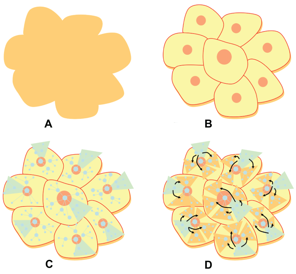 (A) Full geographic scale that we want to spread to, covering the entire country. (B) Administrative sub-divisions such as districts, provinces, or states represented as petals in a country. (C) Blue dots representing health facilities and community structures that provide service(s) in a country. (D) Movement of spread agents from their original facilities to facilities in other slices.