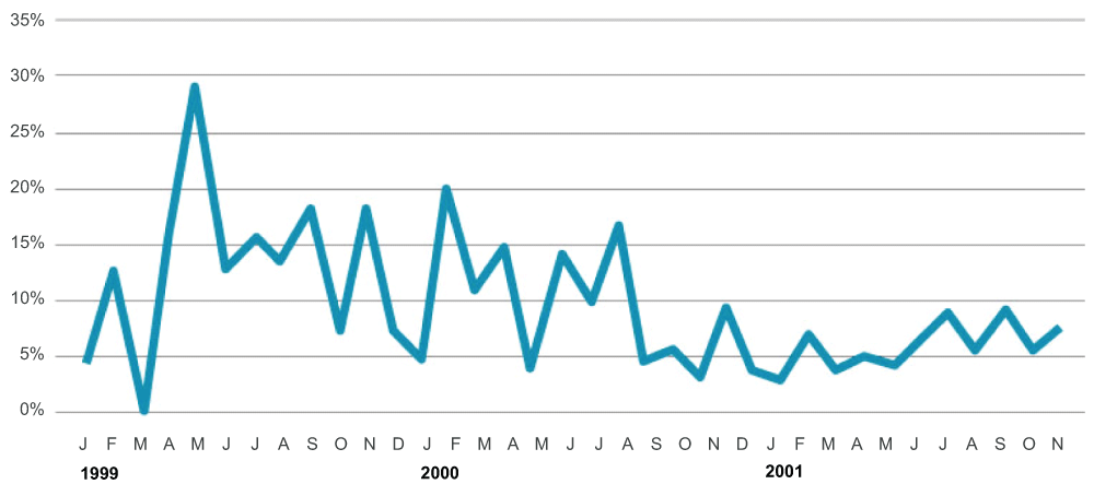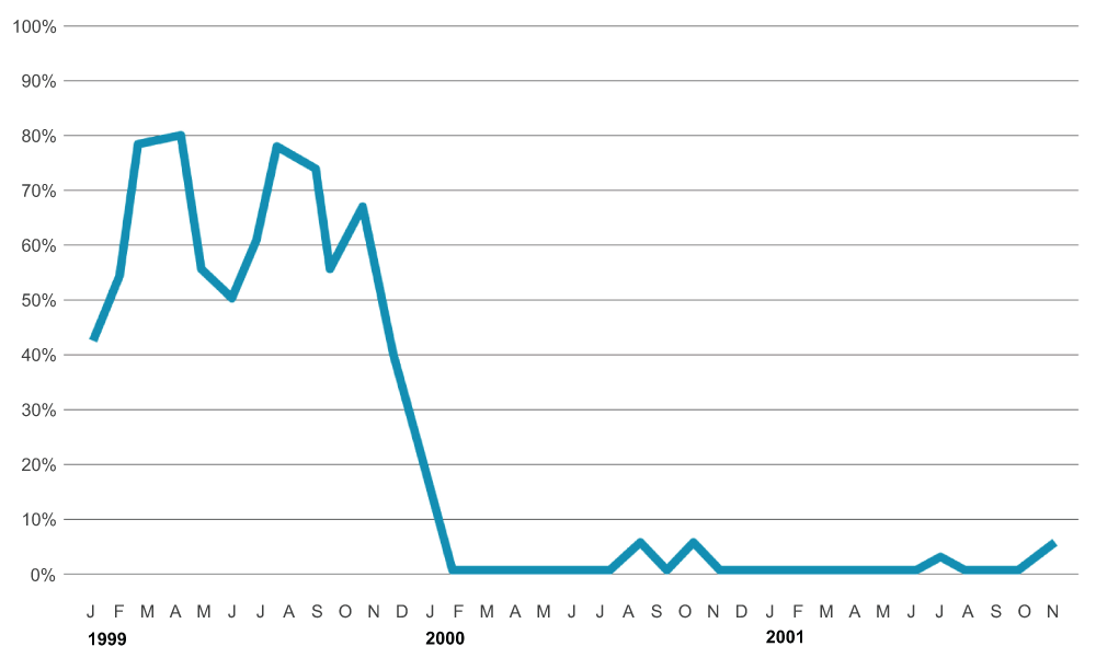 Figure 3. Tver Oblast, Russia: percentages of neonates with respiratory distress who died in the first week of life.