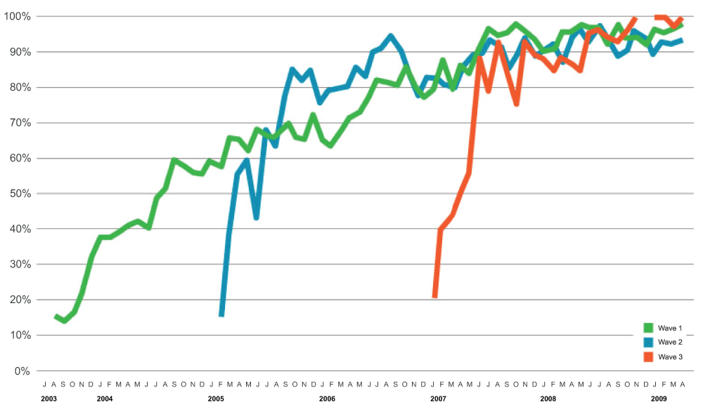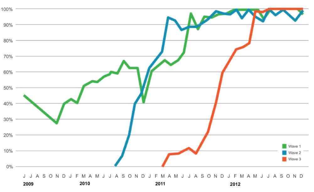 Figure 5 is a time-series chart from Afghanistan that presents the results of the collaborative improvement that sought to reduce maternal deaths by introducing active management of the third stage of labor. This practice has three services, all delivered immediately after birth to prevent hemorrhage: provision of oxytocin, cord traction, and uterine massage. The graph covers the period June 2009–December 2012, with the results of wave 1 shown in green, wave 2 in blue, and wave 3 in red. Note that the lines for waves 2 and 3 are much steeper than that for wave 1, indicating that the rate of provider adoption of this intervention was much faster than wave 1, a phenomenon that is discussed next.