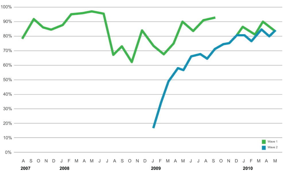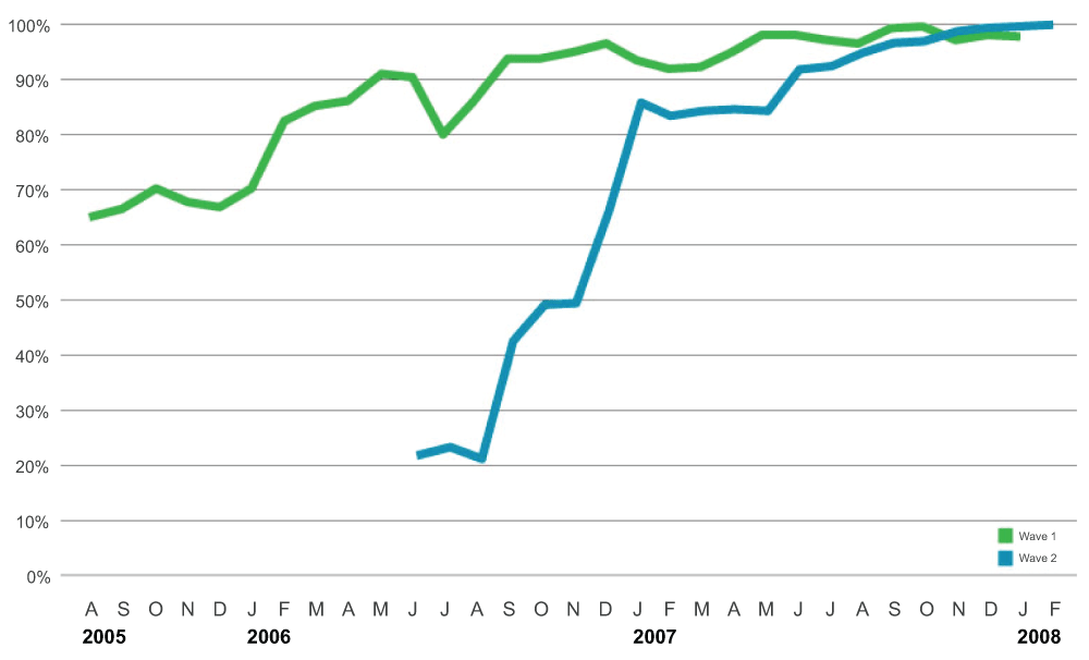 We have since seen this faster/easier/better phenomenon in other places and other interventions including AMTSL in Ecuador10, tuberculosis (TB) and HIV in Uganda, Prenatal Care in Guatemala and Integrated Management of Childhood Illness in Niger (Figure 6–Figure 9). Due to the similarity in context from wave 1 to subsequent waves in these countries, relatively few adaptations were made to the change package developed in wave 1. This rate of adoption phenomenon warrants further research11. Please note that these graphs were chosen to reflect the rate of spread/acceptance/adoption we are seeing with the wave sequence spread approach.