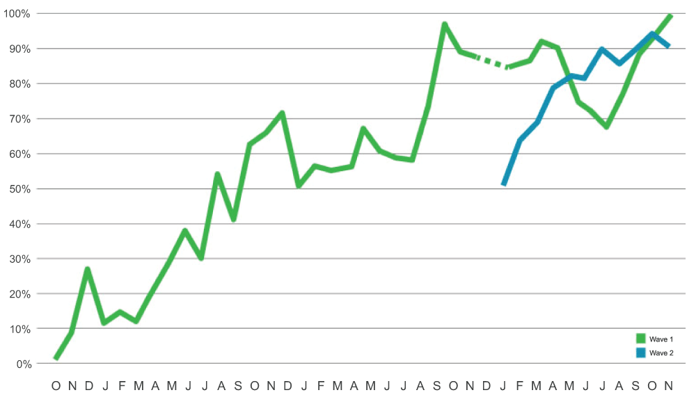Surprisingly though, provider adoption happened faster and more easily and achieved even better results. Implementation of the second and subsequent waves also had fewer problems: spot checks confirmed that the adoption was happening with fewer problems. The ease with which the changes could be transferred and applied by new facilities during subsequent waves can possibly be attributed to the “homophily” factor: the degree to which pairs of individuals who interact are similar in certain attributes, such as beliefs, education, social status and the like2. The spread was conducted by peer providers who had implemented the changes and obtained the improved results in similar facilities in the same context.