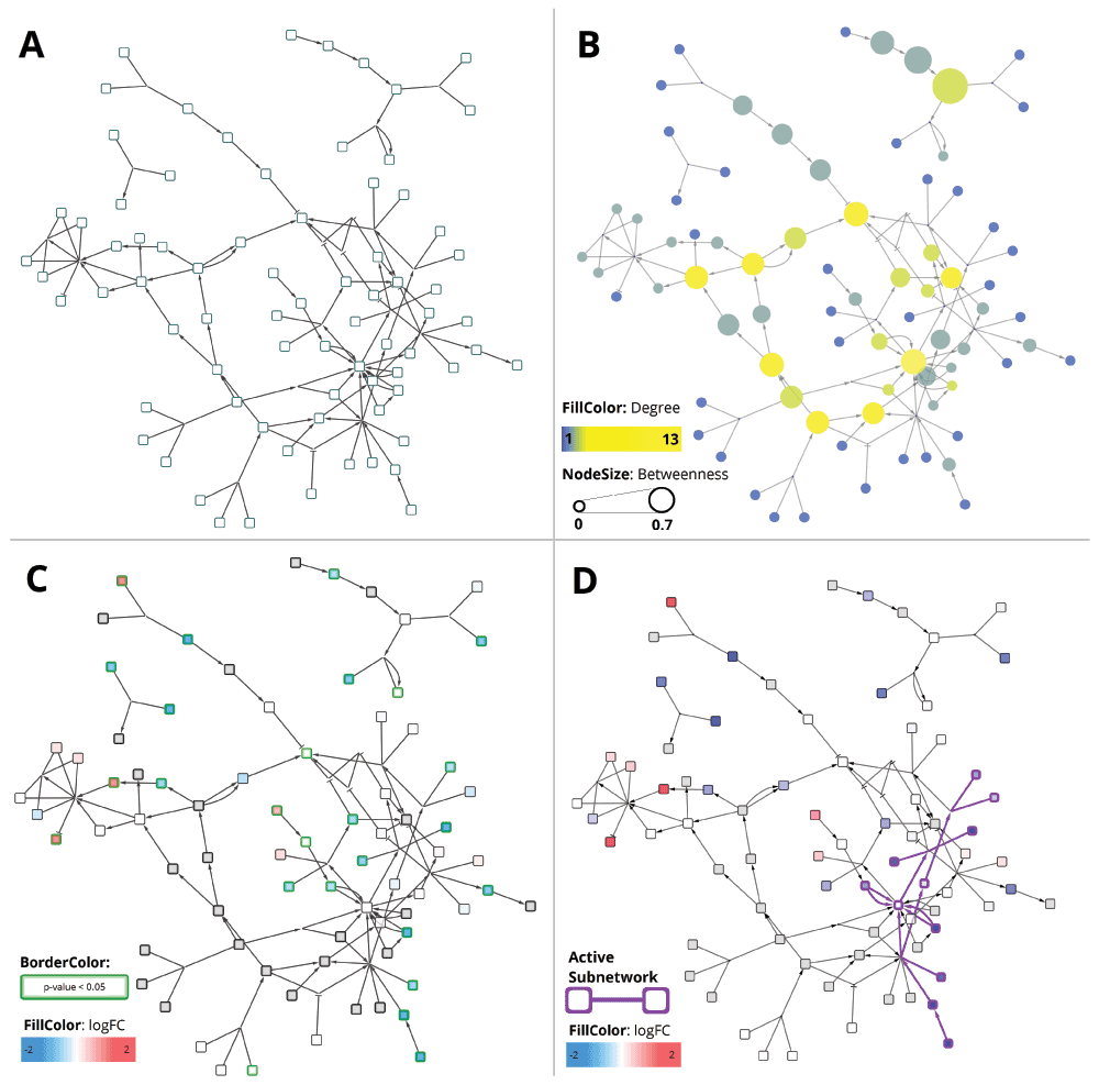 (A) The simple network does not contain graphical annotations of the pathway. (B) NetworkAnalyzer was used to visualize node degree and betweenness of the nodes in the network to identify important hub nodes. (C) The logFC of the example dataset is visualized as node fill color with a gradient (blue over white to red) and the adjusted p-value < 0.05 is highlighted with a green border color. (D) jActiveModules finds active subnetworks (highlighted in purple) that are affected by varying gene expression.