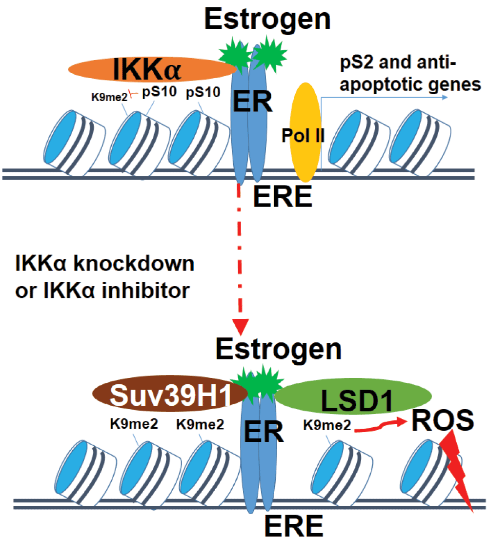 In short, Perillo's group identifies a novel crosstalk between IKKα and estrogen signaling and shows that inhibition of IKKα-mediated histone phosphorylation switch ER-mediated anti-apoptotic effects to ER-dependent ROS-mediated breast cell death, which implicates potential dual-therapy of ER agonist (E2) together with IKKα inhibitor (BAY) in a variety of hormone-regulated cancers.