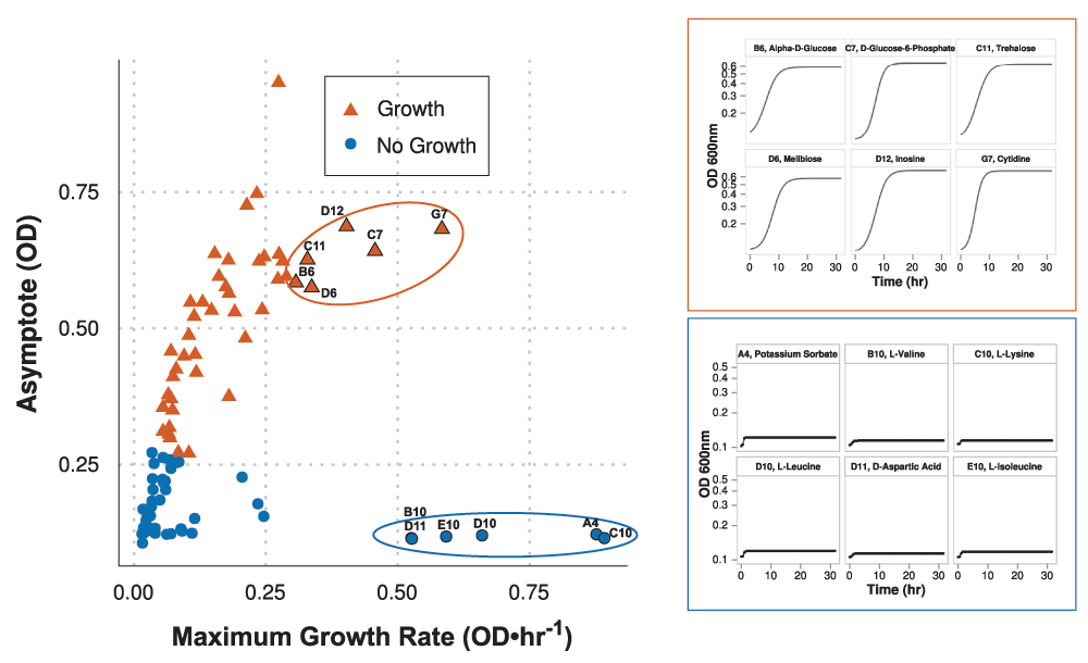 I note that you used manual inspection of growth curves just under the 0.5 cutoff... this is another area in which a statistical confidence in that value might help. If this is to become truly high throughput, manual inspection becomes untenable except in a few cases.
