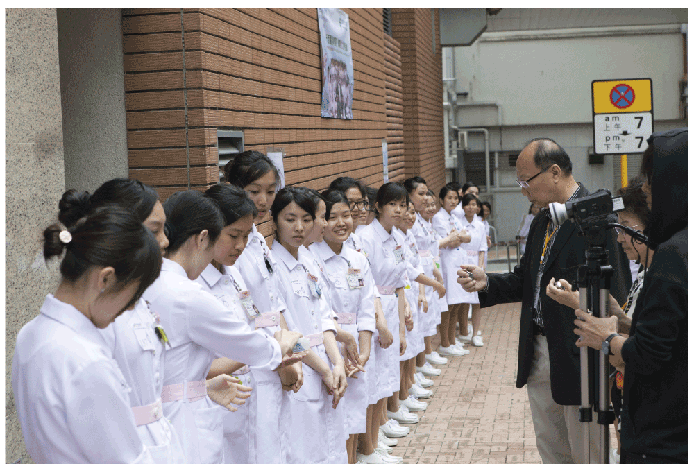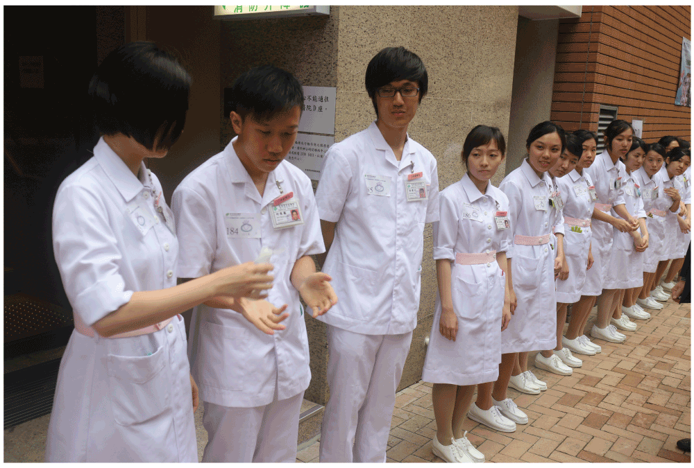 Figure 2. Row of nurses in the relay, the first nurse has just performed hand hygiene correctly and is pouring the alcohol hand rub for the next person.