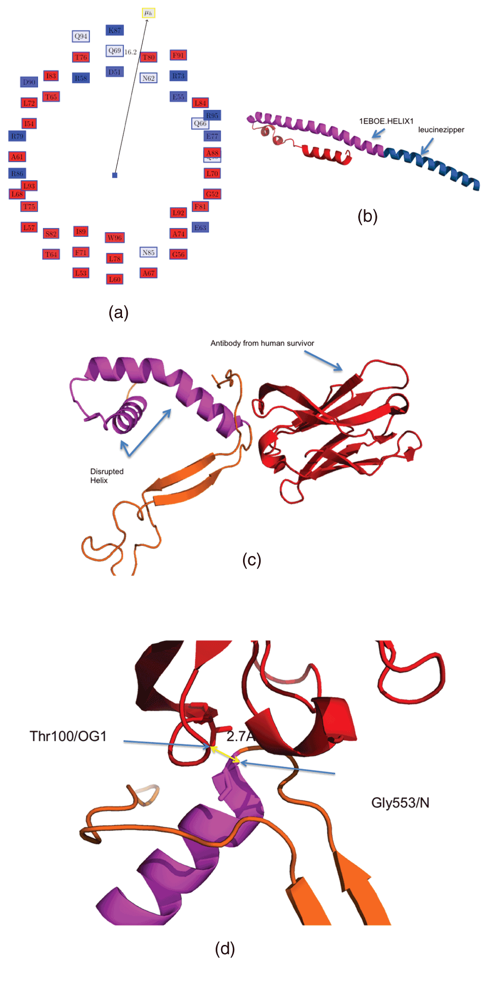 (a) Edmundson wheel for 1EBOE.HELIX1. The hydrophobic moment vector is not to scale. The color coding is as follows: all hydrophobic residues are colored red, while hydrophilic residues are colored in blue: dark blue for positively charged residues, medium blue for negatively charged residues and light blue for amides. (b) Structure of PDBid:1EBOE, 1EBOE.HELIX1 is marked in magenta and the leucine zipper is in blue. (c) 1EBOE.HELIX1 is disrupted by an antibody derived from a human survivor of the 1995 Kikwit outbreak (PDBid:3CSY). (d) Gly553/N on 1EBOE.HELIX1 makes a possible hydrogen bond to Thr100/OG1 at a distance of 2.7 Å.