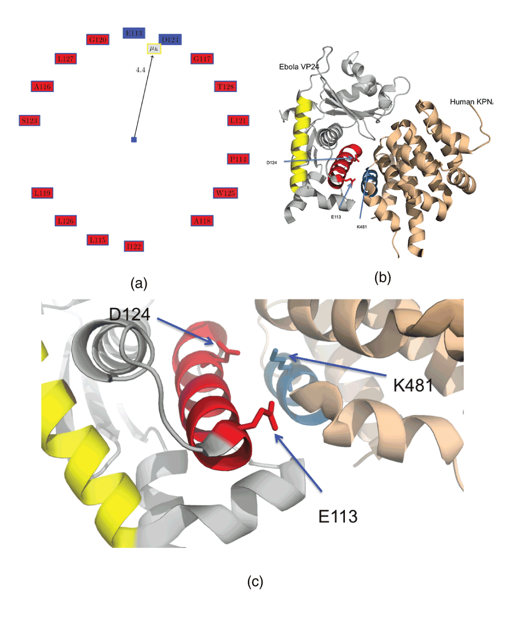 (a) Edmundson wheel for 4U2XA.HELIX5. (b) Complex of VP24 (PDBid:4U2XA) and human karyopherin alpha nuclear transporters (KPNA) C terminus (PDBid:4U2XD). (c) D124 from VP24 probably has an electrostatic interaction with K481 from KPNA. This interaction is sufficient to interfere with the immune response to Ebola infection.