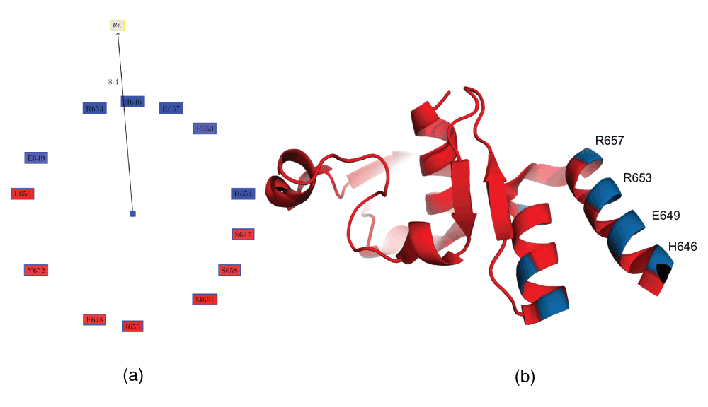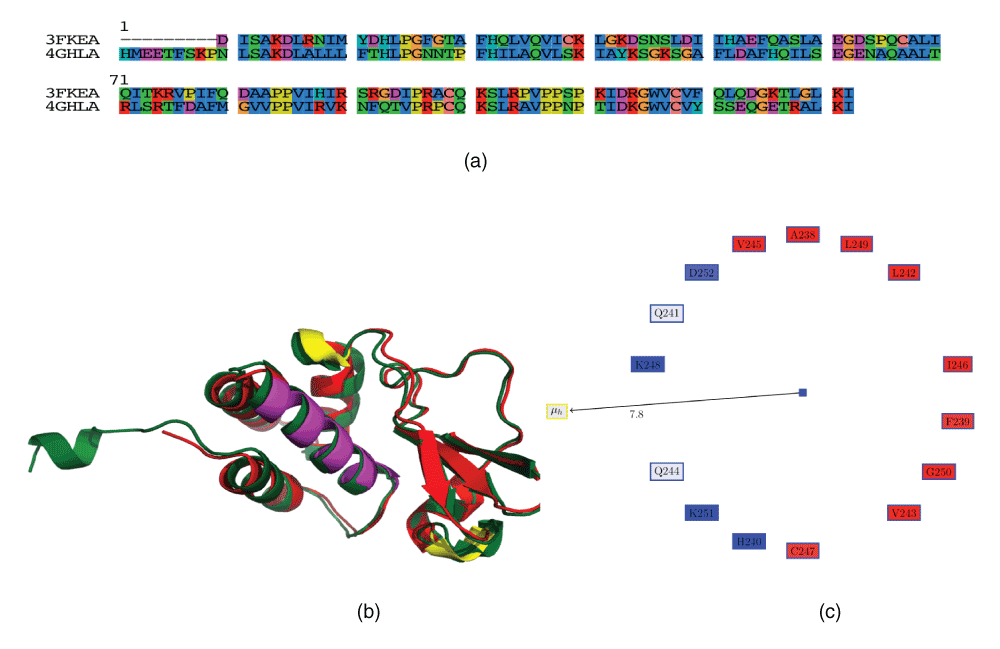 The next helix having a high proportion of negatively charged residues (3FKEA.HELIX2) is from a VP35, a classic example of a moonlighting protein, that can be a component of the viral RNA polymerase complex, a viral assembly factor, or inhibitor of host interferon production33. We have not been able to identify a critical role for this helix in the protein from current literature. However, VP35 consists of several helices, and is reasonably conserved in the Marburg virus from the same Filoviridae family (42% identity, 58% similarity) (Figure 3a). Often, it is difficult to identify the regions of the protein that differ from a sequence or structural alignment (Figure 3b), in case there is interest in understanding different responses of the proteins to known drugs or even the immune system. Table 4 compares the characteristics of the helices in the VP35 from Ebola and Marburg (the helix numbering is offset by one, due to a small N-terminal helix in the Marburg protein (which might be due to crystallization technique differences and probably is not critical). Thus, we have numbered these helices using alphabets. It can be seen that most of the helices have the same properties, barring helices E and F, where the acidic residue is present in the E helix in Marburg and in the F helix in Ebola. These helices are marked in yellow in Figure 3b. Also, it can be seen that helix C, which has a high proportion of acidic residues in VP35, has a fewer number of those residues in Marburg. The difference in the pathogenicity of these viruses are encoded in the structure of the expressed proteins, and the design of drugs and vaccines to counter virulence should take these differences into account.