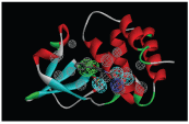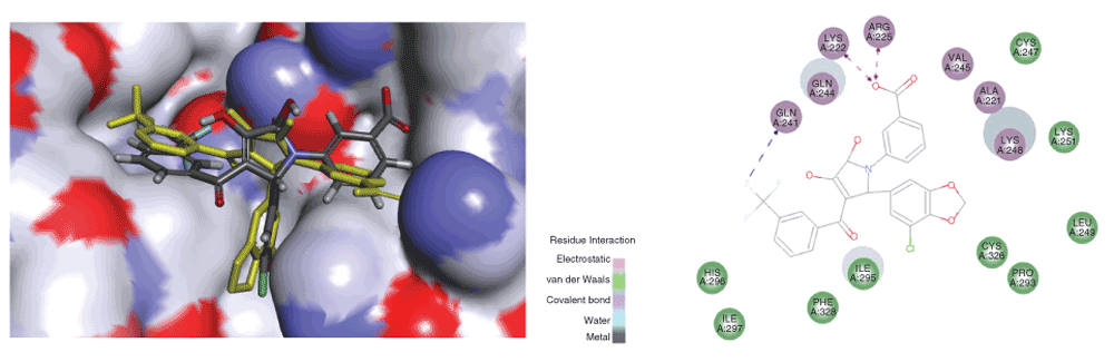 Redocking the 4IBI ligand in the protein resulted in an RMSD of 3.02Å, which generally indicates the difficulty of predicting orientations for compounds binding in what is a relatively hydrophobic and shallow pocket (Figure S1). This molecule was ranked the 29th pose and had a LibDock score of 86.62 (Figure S1). The four FDA approved drugs were docked into the VP35 structure 4IBI. All compounds docked similarly and overlapped with the co-crystal ligand (Figure 2). Amodiaquine and chloroquine had higher LibDock scores (> 90) than the 4IBI ligand, while clomiphene and toremifene had LibDock scores less than 70. All four FDA approved drugs bound similarly to the pyrrolidinone ligands in the pocket formed by residues from the α-helical and β-sheet subdomains15. We have highlighted proposed energetically favorable interactions of the antimalarial candidate binders with ILE295, LYS248 and GLN244, which scored favorably. Previously published studies suggested mutation of ILE295, LYS248 resulted in near-complete loss of binding activity15.