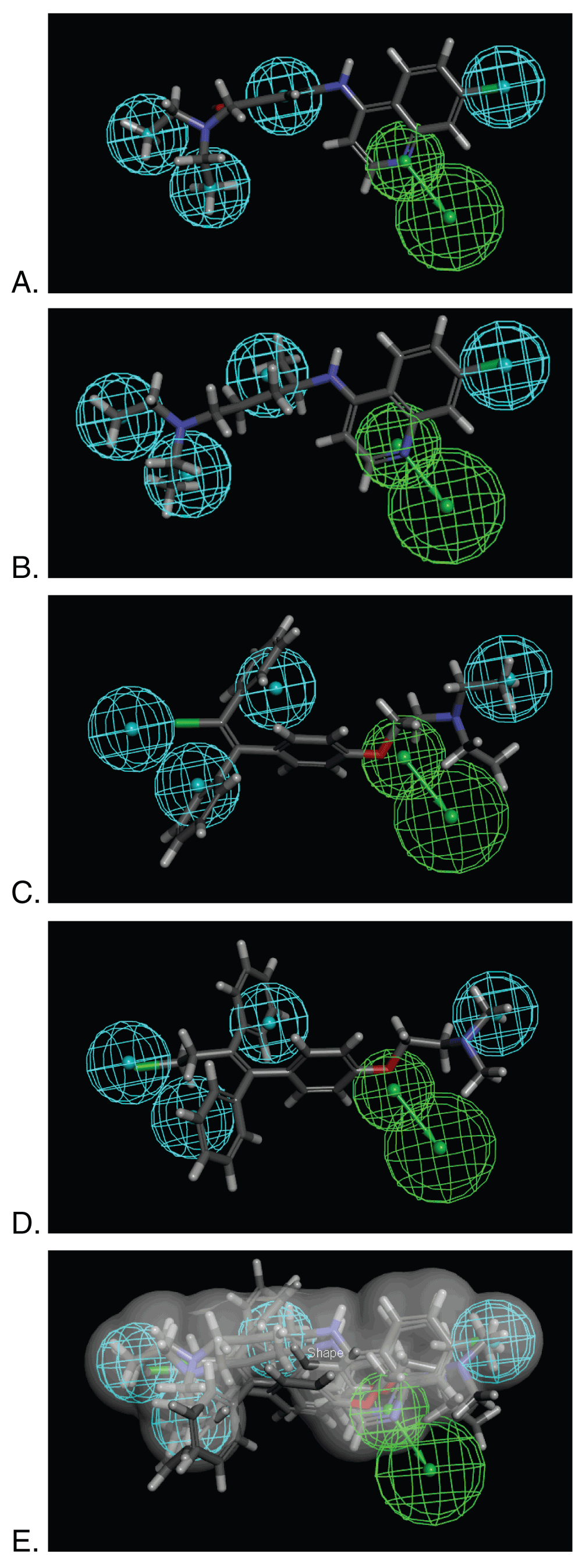 The pharmacophore was generated using the in vivo and in vitro active amodiaquine, chloroquine, clomiphene and toremifene (Supplemental Table 1) as these represent the most relevant FDA approved drugs to date. This pharmacophore consists of 4 hydrophobic features and a hydrogen bond acceptor feature (Figure 1). The pharmacophore with van der Waals surface was also used to search FDA drug various libraries (Supplemental Table 2 and Supplemental Table 3). The most interesting observations from this virtual screen are that various estradiol analogs score well (e.g. estradiol valerate Fit value 4.23). Previously estradiol was suggested to be active in the EBOV pseudotype assay in vitro8. In addition, dibucaine was also retrieved (Fit value 1.58) which was also active in the EBOV pseudotype assay8. Amodiaquine, chloroquine, clomiphene and toremifene can be used as positive controls for future screens. Because the original complete sets of FDA approved compounds screened are not publically accessible it is difficult to compare hit rates versus all compounds tested to date.
