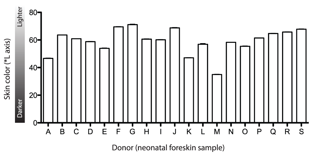 Skin color determination is shown for each sample. *L Score is measured by reflective colorimetry and represents color of the skin on a black-white axis. Lower *L score is indicative of a more darkly pigmented phenotype. Data represent the average *L score ± SEM for three measurements per skin sample.