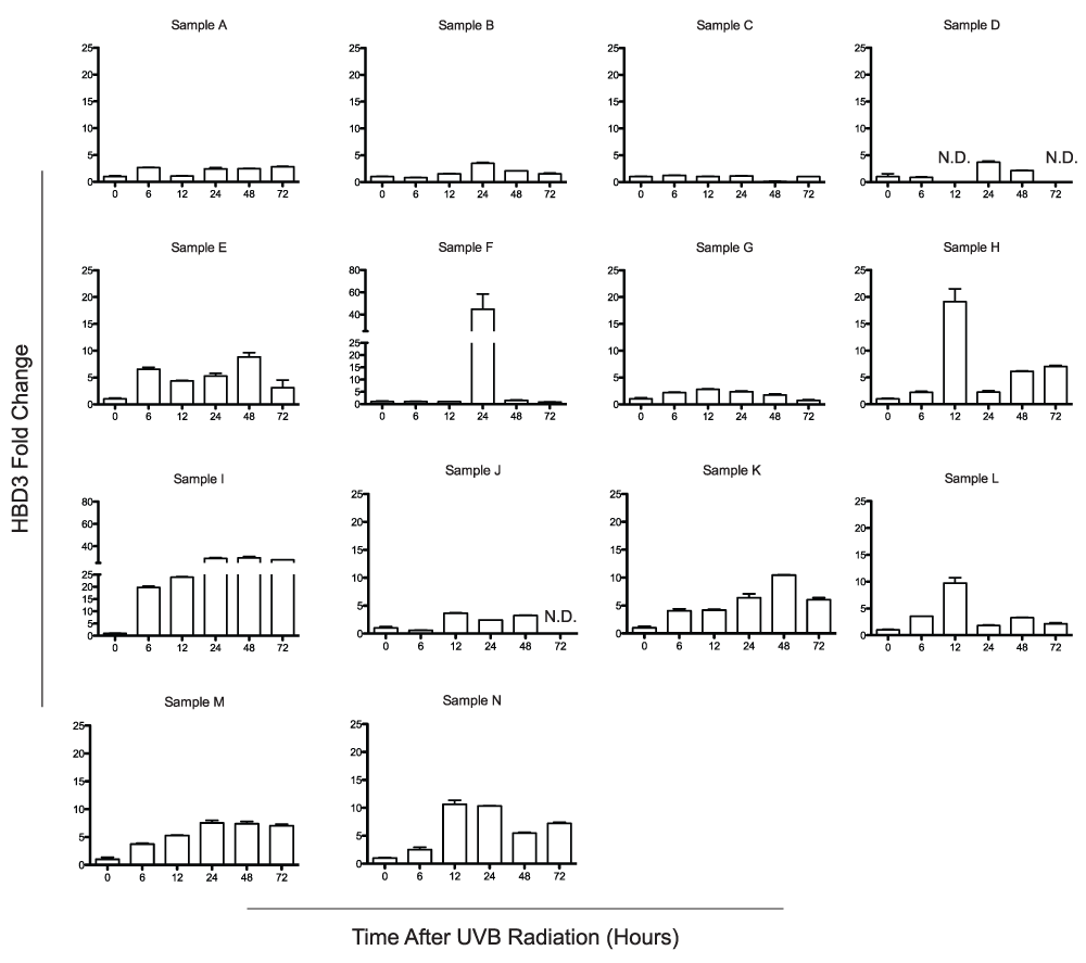 Figure 2. BD3 expression over time among 14 distinct donor after UV radiation.