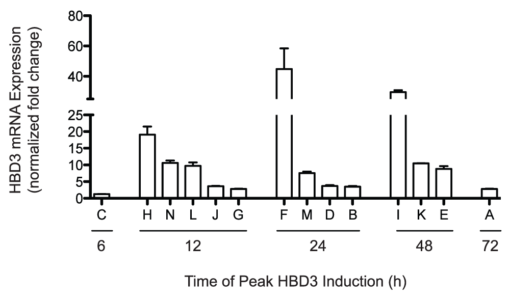 Peak BD3 mRNA expression for human skin explants (n=14) is arranged by time of maximal induction for each individual donor. qRTPCR was performed in duplicate for each sample, and results are expressed as mean fold change over control ± SEM.