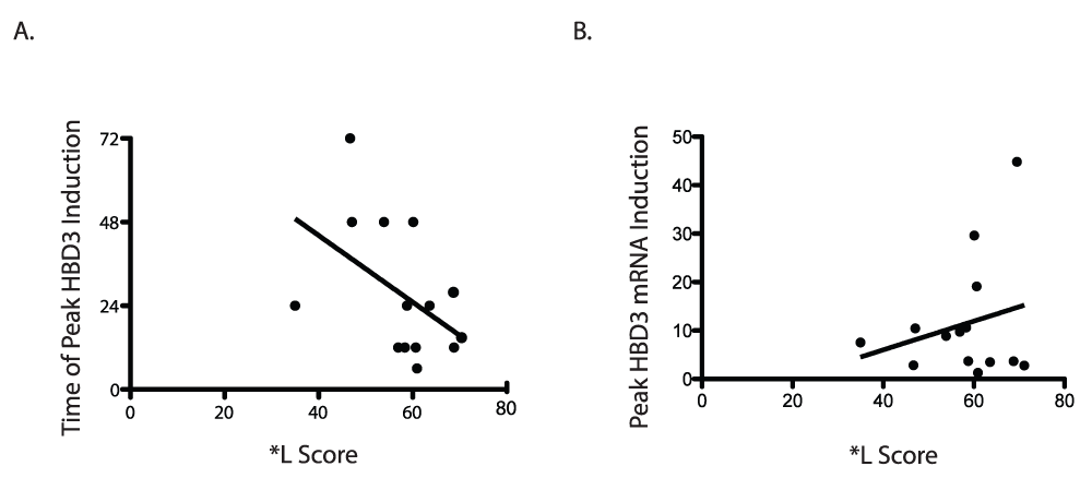 A) *L score versus peak BD3 mRNA induction. qRTPCR was performed in duplicate for each sample, and data represent mean BD3 induction for 14 human skin explants. There was no correlation between donor *L score and amplitude of BD3 induction (r2 = 0.057, p = 0.41). B) *L score versus time of peak BD3 mRNA induction. qRTPCR was performed in duplicate for each sample, and data represent mean BD3 induction for 14 human skin explants. Although a weak negative trend existed between donor *L score and time of BD3 induction, the correlation was not statistically significant (r2 = 0.234, p = 0.08).