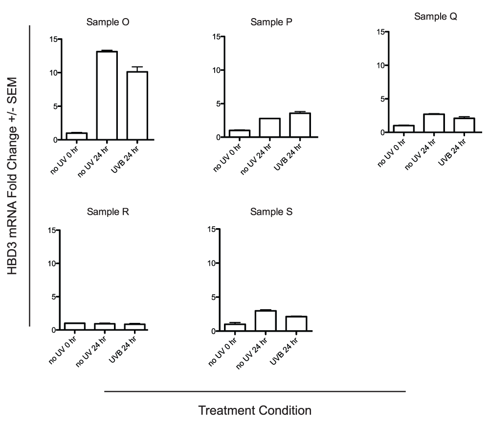 Five additional human skin explants were treated ex vivo with 0.5 J/m2 UVB radiation. BD3 mRNA expression for the UV treated biopsy and an untreated time matched control was compared to an untreated control taken at the time of UV treatment. qRTPCR was performed in duplicate for each sample, and data represent the mean fold change over the untreated control taken at the time of UV treatment ± SEM. BD3 induction in the human skin samples was independent of UVB treatment.