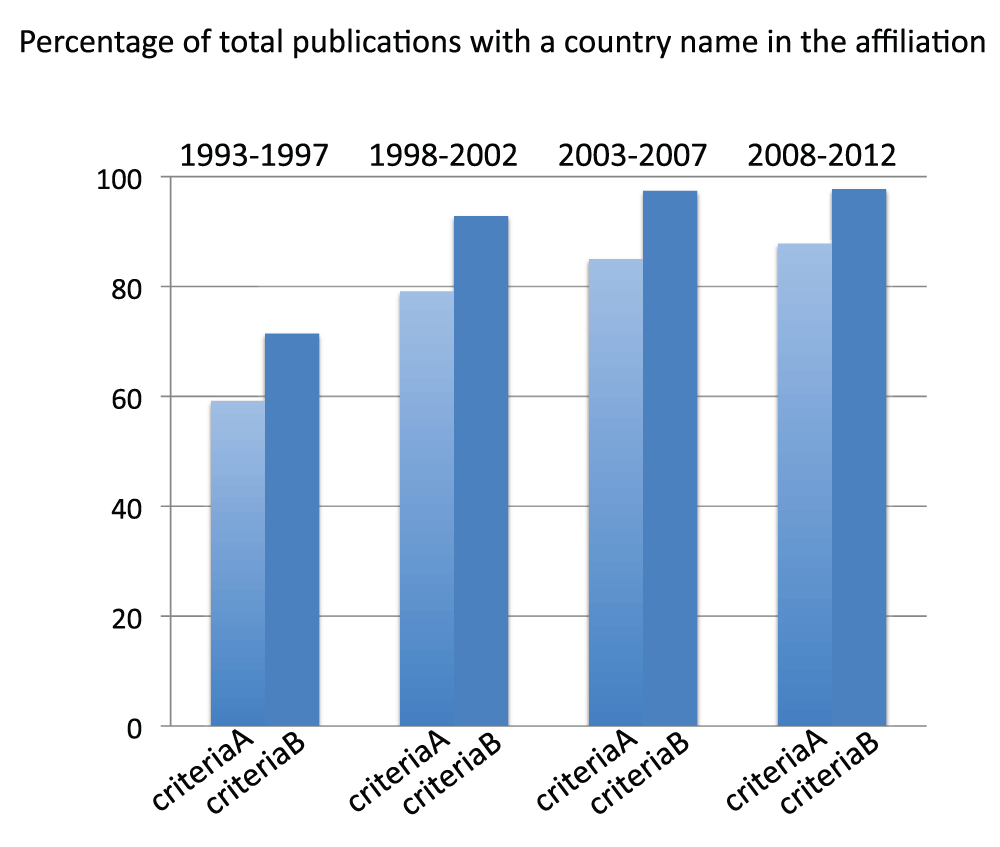 Third, this method relies on first authors’ affiliation information to attribute publications to a certain country. Given that the first author ordinarily either matches the corresponding author or has the same affiliation country of the corresponding author and that the first author (even when she/he is not the corresponding author) frequently plays a prominent role in the project design or execution, this approach has the advantage of classifying papers based on the effective location of the main ideation and execution of research projects. Thus, this method is useful to determine publication outputs based on leading contributions; however, it is less accurate when all types of contributions need to be taken in account. It should also be noted that at the beginning of 2014, PubMed started inserting affiliation information for every author of published articles, however without the possibility of limiting the search to first authors (http://www.ncbi.nlm.nih.gov/books/NBK3827/#pubmedhelp.Affiliation_AD). Therefore, the method used in this paper cannot be used for papers published in 2014 or after. While PubMed’s decision to include information for all authors of a paper is welcomed, it would be desirable to be able again to select affiliation information only for the first (and possibly also specifically for the last) author.
