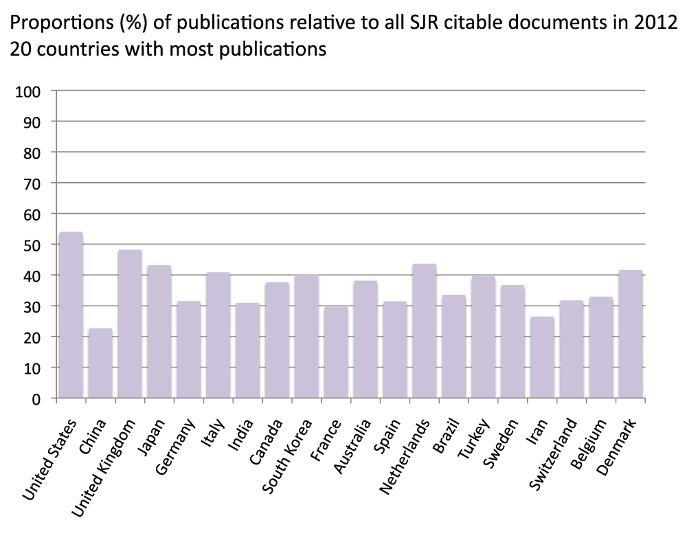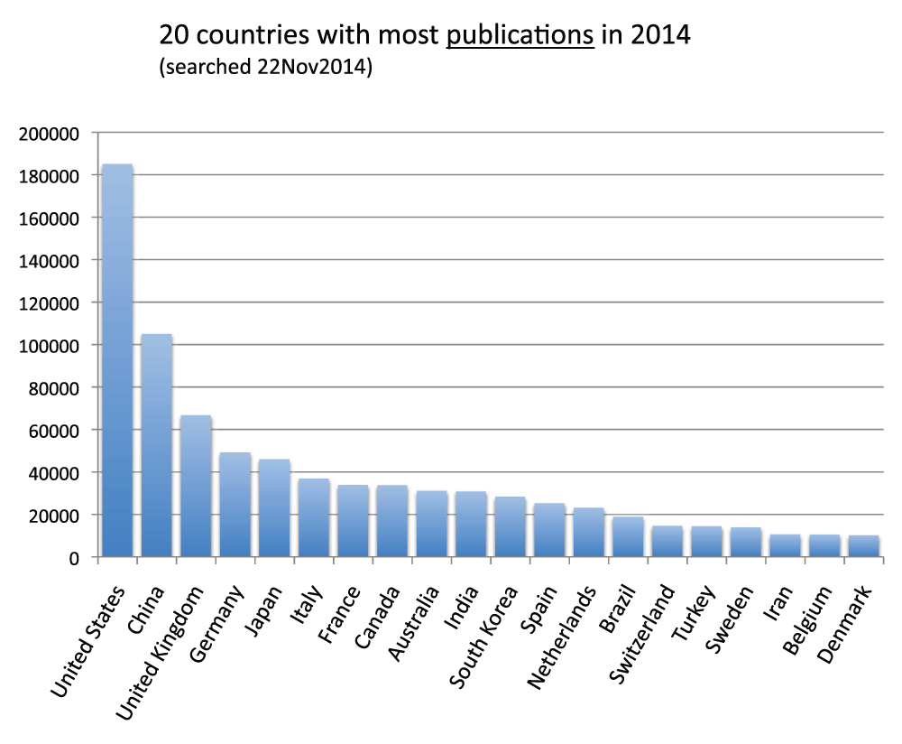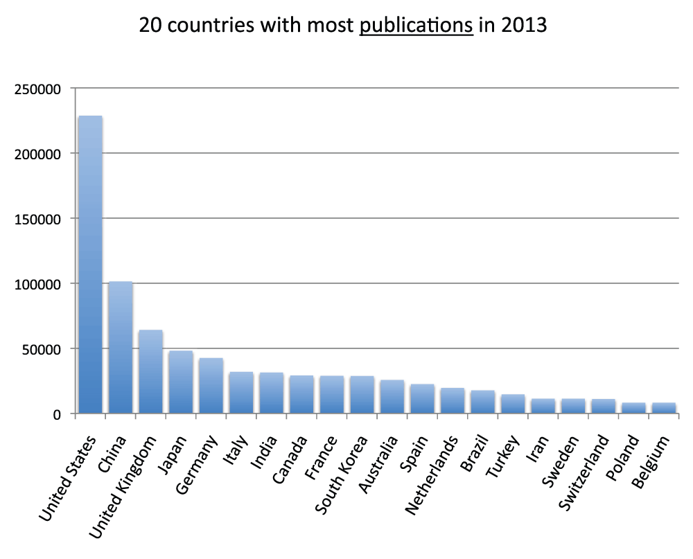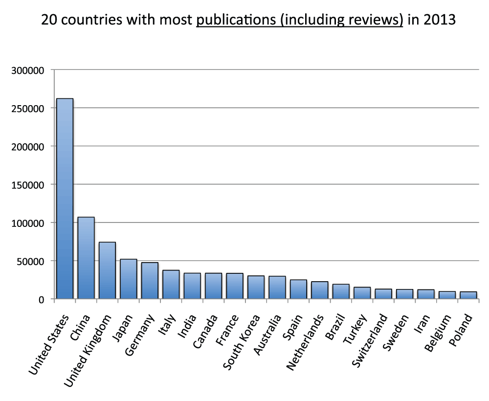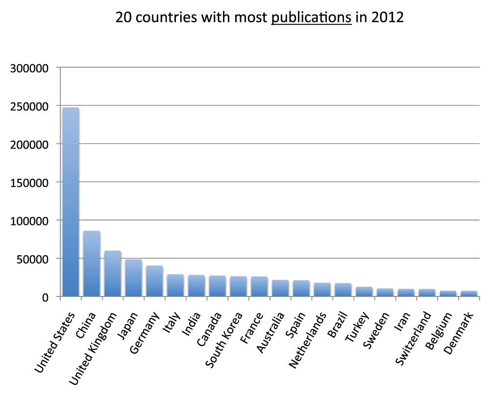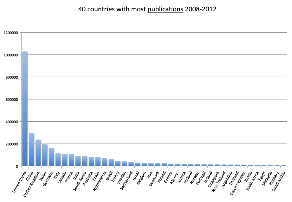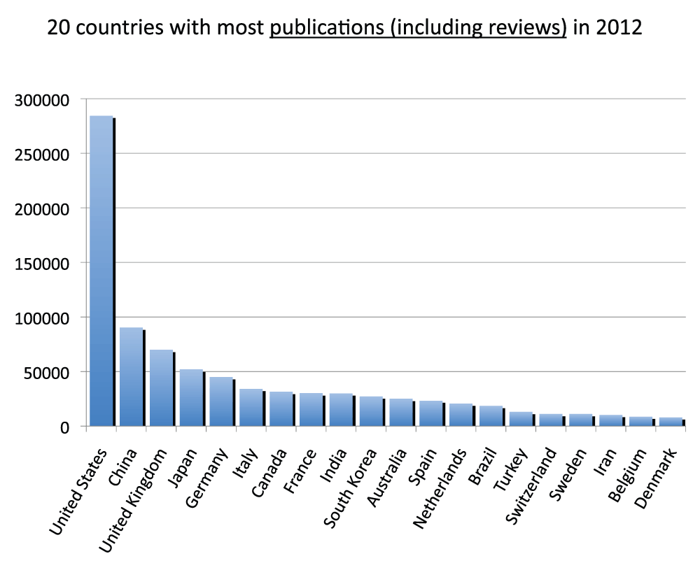 The United States, with over one million publications in years 2008–2012 (reviews excluded) is by far the country with the most publications, having almost four times the publications of the second ranking country, China