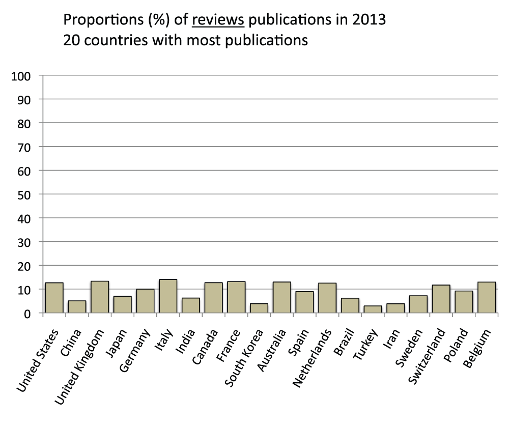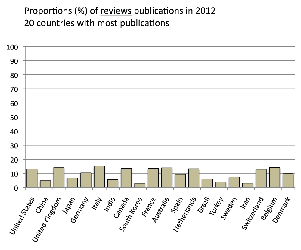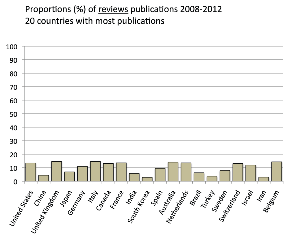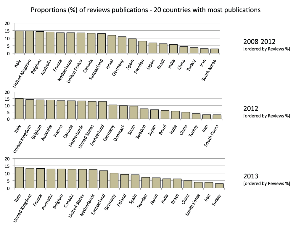The proportion of review publications for the 20 countries with the most publications is 9.9%, with a maximum for Italy (14.7%) and a minimum for South Korea (2.9%) (years 2008–2012)