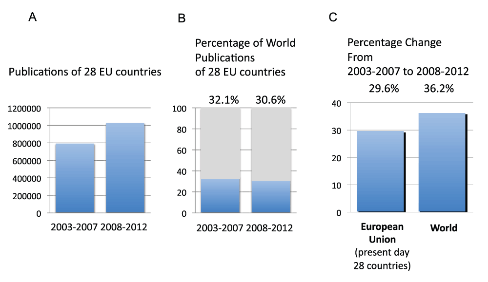 The proportion of world publications of the present day 28 countries of the European Union is 30.6% (years 2008–2012)