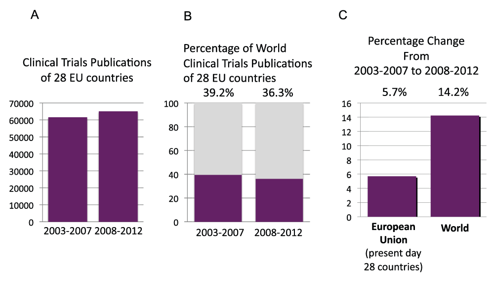 We calculated the number of publications of the 28 countries that are currently part of the European Union (EU Countries) in time periods 2003–2007 and 2008–2012. The publications during the time period 2008–2012 were more than one million (Figure S14A) (sheet 24) and represented 32.1% and 30.6% of the world’s total publications in the time periods 2003–2007 and 2008–2012, respectively (Figure S14B). The relative increase from time period 2003–2007 to time period 2008–2012 of the EU Countries was 29.6%, therefore smaller than the relative increase for the whole world (36.2%) (Figure S14C). We also calculated the total clinical trials study publications of the EU Countries in time periods 2003–2007 and 2008–2012 (Figure S15A). In time period 2008–2012, there were over 65,000 clinical trial publications. These publications represent 39.2% and 36.3% of the world’s total clinical trials publications in time periods 2003–2007 and 2008–2012, respectively (Figure S15B). The relative change in clinical trial publications from time period 2003–2007 to time period 2008–2012 was a 5.7% increase for the 28 countries, compared to a 14.2% increase for the whole world (Figure S15C).