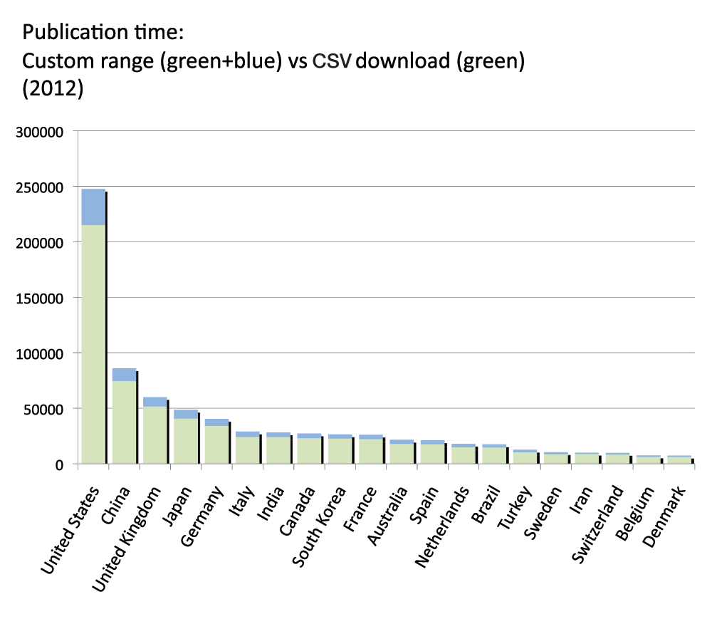 PubMed provides a function to automatically download CSV files with the numbers of publications year by year. We compared the numbers of publications obtained by using this function with the numbers of publications obtained by using the custom range function to define time periods that we described above. An analysis of the 2012 reveals that the CSV download yielded fewer publications than the custom range approach. Figure S16 (sheet 25) shows the differences for the 20 countries with the most publications in 2012. On average the difference was -18.4%, with a maximum difference of -21.7% for Turkey and a minimum difference of -13.8% for Iran.