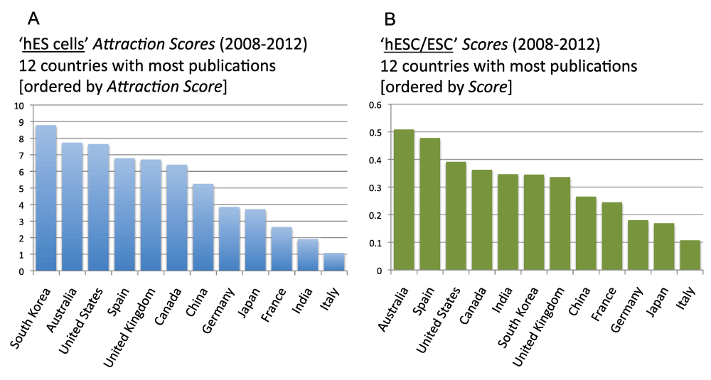 Though a detailed and comprehensive analysis of correlations and predictive uses of the Attraction Scores is beyond the purposes of this study, we want to provide an example of how the Attraction Scores can be used to assess the effect of specific policies. To this end, the policies regulating the use of hESCs in research present an interesting cases study. Over the past 15 years, countries have adopted a wide range of policies that can be divided into four categories—permissive, permissive compromise, restrictive compromise, and prohibitive15. In restrictive policy countries, human embryo research, derivation of hESCs from supernumerary embryos, and somatic cell nuclear transfer (SCNT) are usually prohibited. When permitted, research is possible with imported hESC lines or cell lines that were created before the enactment of any embryo research ban. Predictably, the two countries with the most restrictive policies (Italy and Germany) report very low Attraction Scores (Figure S17) (sheet 20). Attraction Scores are progressively higher as countries’ policies become more permissive. The highest Attraction Scores belong to South Korea and Australia. This conclusion is reinforced by the analysis of a second score (hESC/ESC score), which assesses the relative focus on human embryonic stem cells. This score is the ratio between the number of publications on “human embryonic stem cells” and the number of publications on “embryonic stem cells” (searches for these key words were, as usual, in the “Title/Abstract” field). The highest hESC/ESC scores belong to Spain and Australia, in which SNCT and derivation of hESC from supernumerary embryos are permissible, with the score of the highest ranking country (Australia) being 4.7 times higher than the score of the lowest ranking country (Italy). Germany reported the third lowest hESC/ESC score.