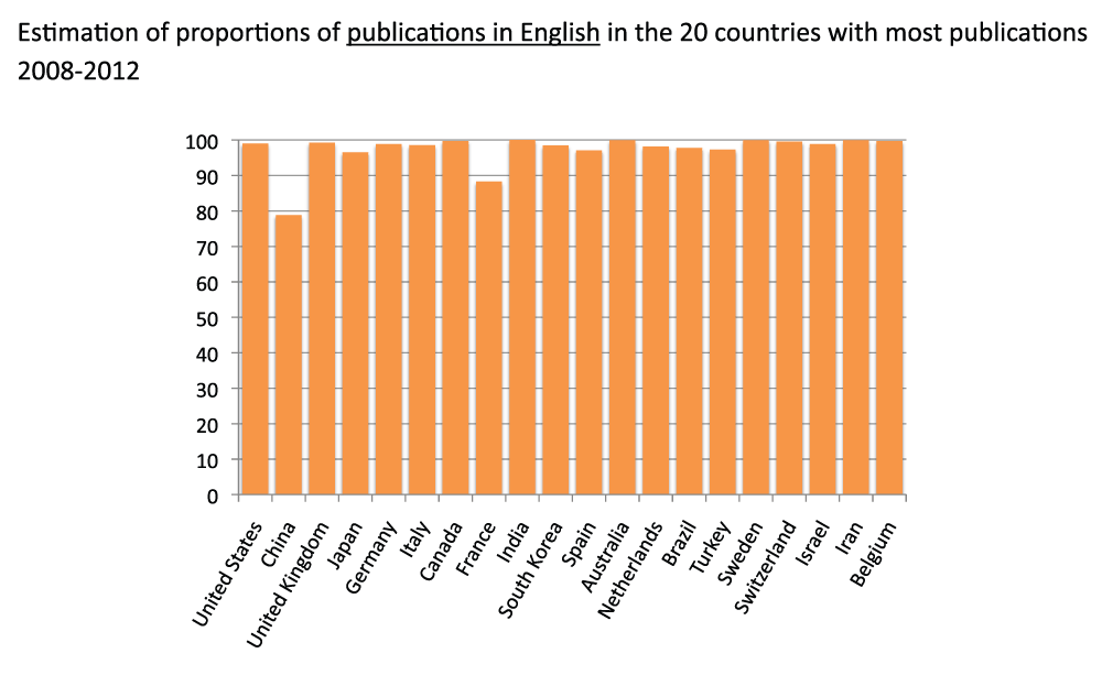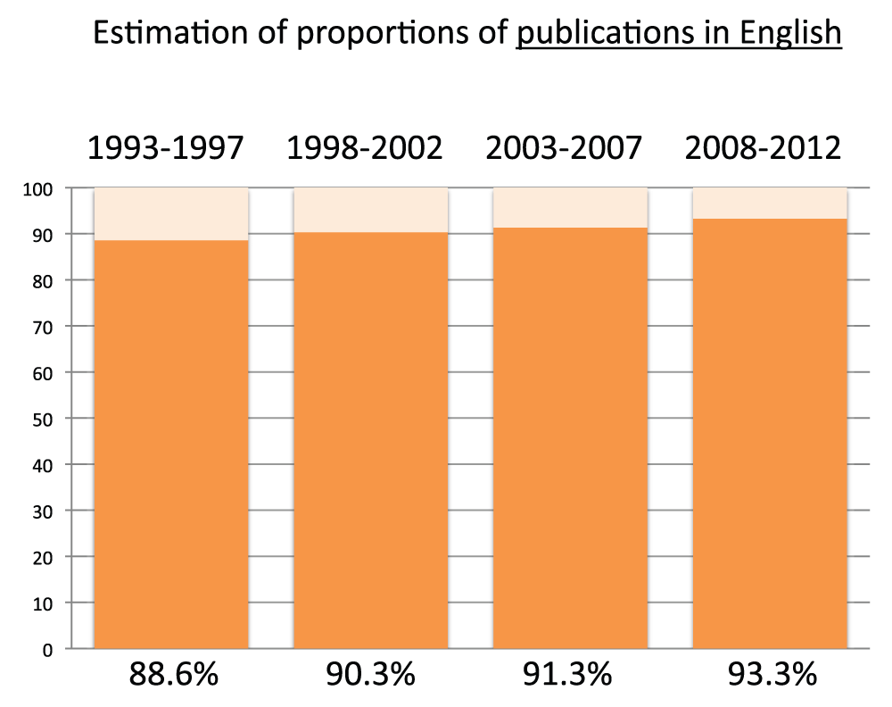 The estimated proportion of publications written in English in countries where English is the primary language has decreased from 50.0% (years 2003–2007) to 46.1% (years 2008–2012)