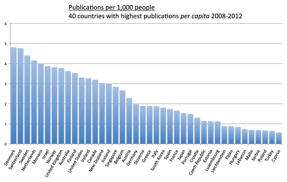 The country with the most publications per capita is Denmark (4.81 per 1,000 people), followed by Switzerland (4.76 per 1,000 people) and Sweden (4.40 per 1,000 people) (years 2008–2012)