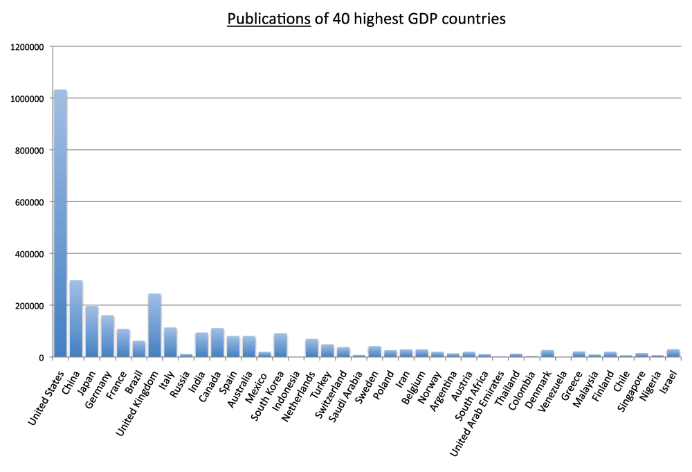 Figure 7. Numbers of publications (reviews excluded) in the 20 countries with the highest gross domestic products (GDP) in the 5-year period 2008–2012.