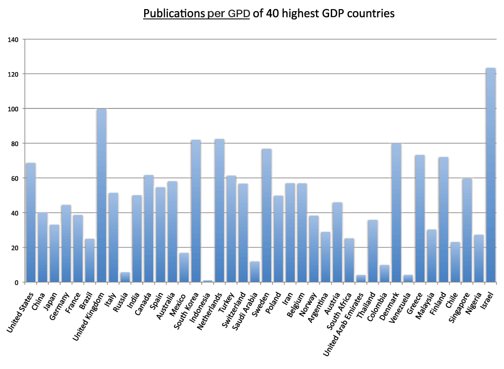 Among the 40 countries with the most publications, Israel has the highest publications per GDP