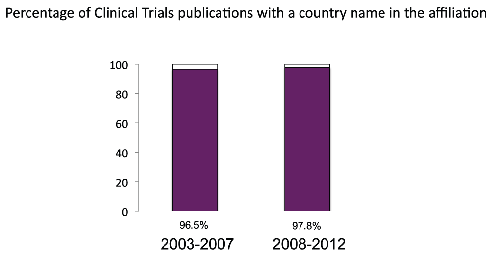 We determined the number of world publications based on clinical trial studies (obtained without searching any country name in the “Affiliation” field, see Methods section), for the time periods 1993–1997, 1998–2002, 2003–2007, and 2008–2012. Also, this type of publication increased at a nearly constant rate throughout this time span. Interestingly, the share of publications based on clinical trial studies has remained nearly constant (close to 5% of total publications) during this time span (Figure 2) (sheet 2).