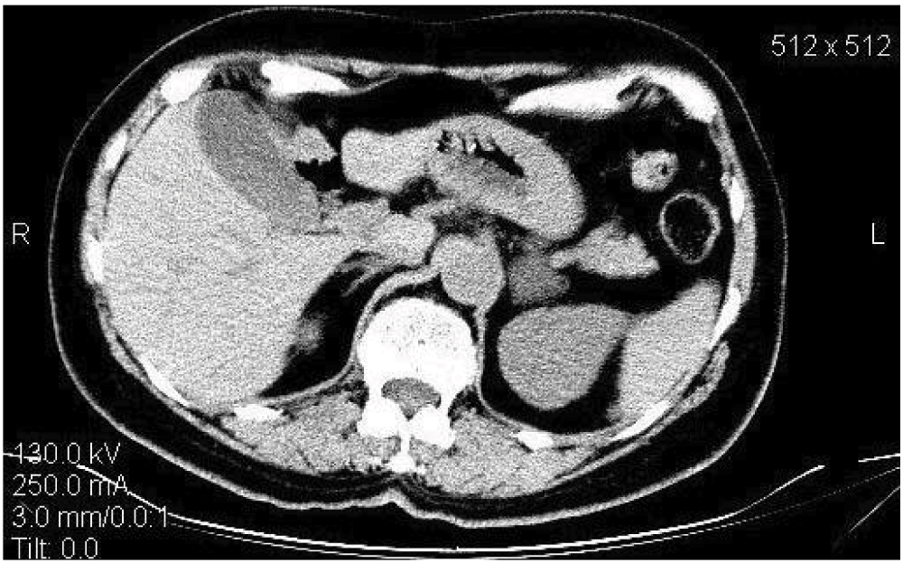 Figure 1. CT scan visualizing 35 mm tumor in the left adrenal gland and a normal right adrenal gland.