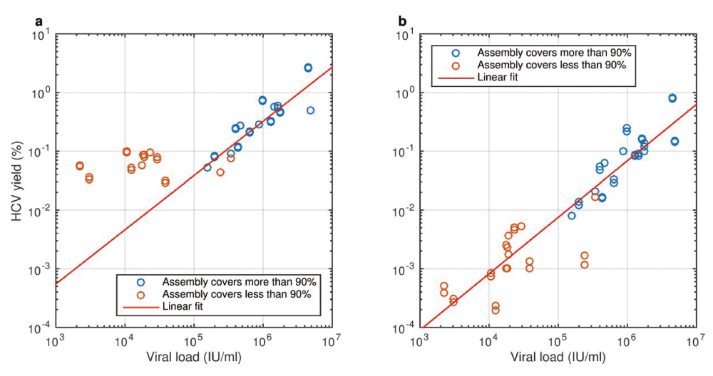 The yield of reads that map to any HCV genome and the probability of successful de novo assembly of a complete genome sequence both depend on viral load (VL). Samples were prepared as replicate libraries that were sequenced simultaneously with consistent yield. Blue circles: successful de novo assembly (>90% complete genome length recovered); red circles: incomplete genome assembly. a. With standard mapping criteria, up to 2.8% of reads match HCV and a background 0.02–0.1% of low-complexity human-derived sequences overwhelms the HCV signal in low-VL samples. Linear trend is plotted for samples with VL > 105 IU/ml. b. Under stringent mapping criteria (mapping Q > 40), lower complexity human and HCV reads are excluded and yield is proportional to VL (slope of linear trend in log-log space not significantly different from 1) across the VL range.