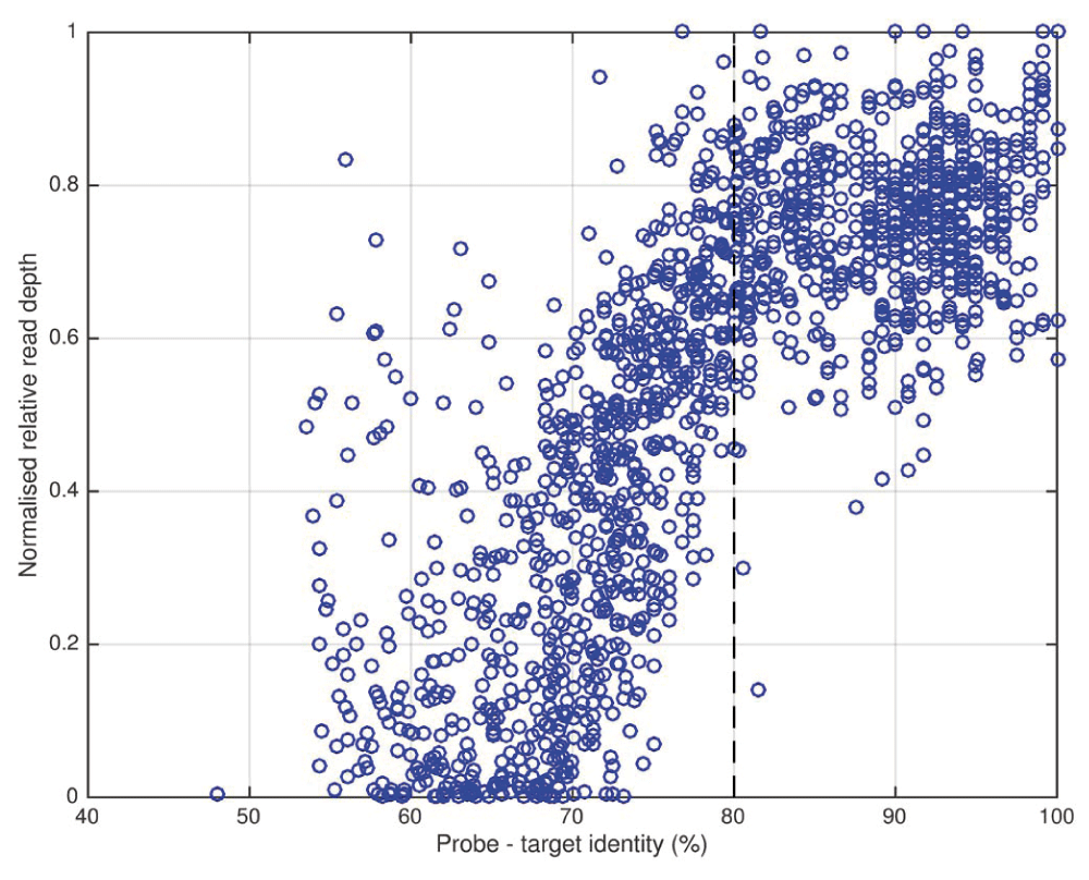 In order to rationalize our approach to probe choice and enable the design of an efficient, comprehensive HCV enrichment probe set, we analysed the relationship between probe-target similarity and the relative efficiency of enrichment (Figure 3). Noting a strong inflection point, we deduced that a minimum 80% identity between a 120 nt segment of sample sequence and its closest matching probe was sufficient to ensure near-maximal enrichment, assuming that each sequencing library molecule interacted with a single probe molecule and ignoring the potential effects of bridging capture (i.e. successful sequencing of a poorly matching fragment effected by hybridization of an adjacent target sequence on the same library molecule to a better-matching probe). The 20% divergence cutoff for successful enrichment falls between the mean inter-subtype (<15%) and inter-genotype (30–35%) divergence levels, explaining why enrichment with a subtype-mismatched probe set leads to only localized bias, while genotype-mismatch results in failure across most of the genome. It also follows from this analysis that when enrichment is performing well, there should be no detectable bias in the representation of single nucleotide variant alleles such as RAVs.