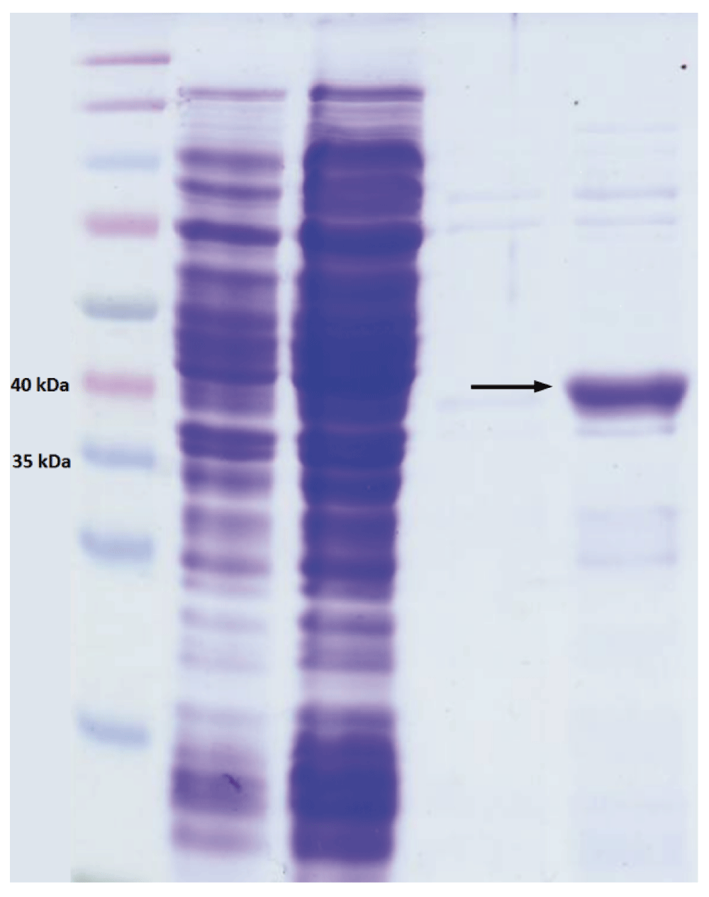 The antigen Ag38-rec was purified using purification kit Protino® NI-TED. It is shown that from the first purification step some copurified protein still appeared (Figure 1). However after dialysis the bands that corresponds to proteins with MW < 20kDa could be removed. The purity of Ag38-rec reached 80%.