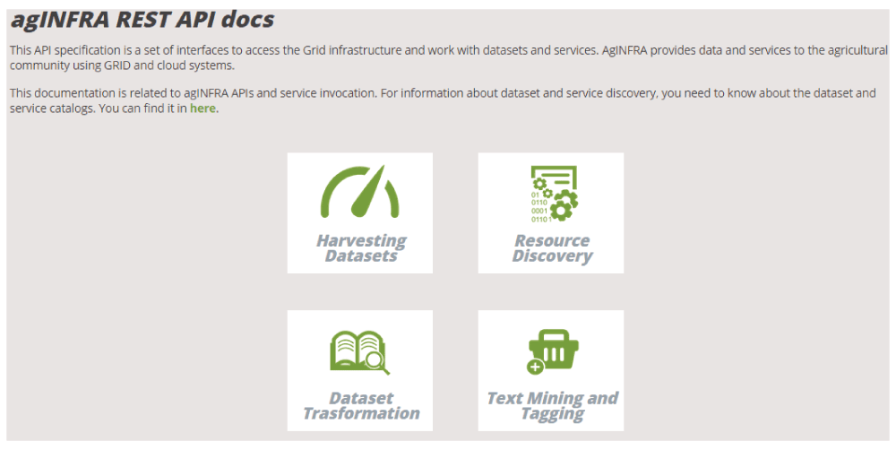 From the beginning of the agINFRA project, it was promised to develop and deliver a shared technology infrastructure. During the lifetime of the project, agINFRA partners designed and deployed research infrastructure components and APIs (Application Profile Interfaces) that support the agINFRA applications and layers in a federated way. The agINFRA Virtual Organisation (VO) has been created to organise the infrastructure provided by the agINFRA partners (Institute of Physics Belgrade - IPB, Instituo Nazionale di Fisica Nucleare - INFN, Computer and Automation Research Institute of the Hungarian Academy of Science - SZTAKI) but also to connect with external infrastructure providers as for example the Greek Research and Technology Network (GRNET), the National Centre for Scientific Research ‘Demokritos’ (NCSR) or other National Grid Initiatives through the European Grid Initiative network. The “vo.aginfra.eu” Virtual Organization (VO) supporting the agINFRA community is operated on the European Grid Infrastructure (EGI) infrastructure, it is supported by all Grid sites participating in the project (AEGIS01-IPB-SCL, INFN-CATANIA, INFN-ROMA3 and SZTAKI), and it is delivering access to more than 2000 CPU cores and 900 TB of storage space to its users. The primary agINFRA Virtual Organization Membership Service (VOMS) server (voms.ipb.ac.rs) is installed at the IPB. The name vo.aginfra.eu is chosen with a format recommended by EGI, and allows global VO registration at CIC portal that will certainly increase VO visibility3. On top of the agINFRA infrastructure a number of application have been ported to the Grid infrastructure (Grid modules) with a RESTful interface on top that enables configuration of application input parameters and output retrieval. For each of the Grid modules, the applications had to be gridified and exposed through a RESTful API (Figure 1). All the ported applications are related with the aggregation and management of data (e.g. agHarvester) and the list of the services is available through the API section of the agINFRA site (www.aginfra.eu/api).