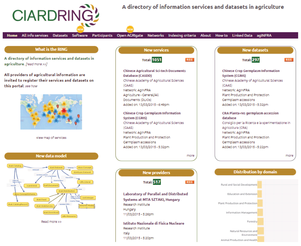 One of the main advances during the agINFRA project was the revamp of the CIARD RING (http://ring.ciard.net) global directory of web-based information services and datasets for agriculture. The CIARD RING, a project maintained within the CIARD initiative and is led by the Global Forum on Agricultural Research (GFAR), has become a machine-readable hub/switchboard to information sources such as search engines, databases, repositories, Open Archives, feeds, data sheets etc (Figure 2). All information stored/registered in the RING i.e. metadata about services and datasets, can be queried via SPARQL and via a simpler REST API. In addition, during the agINFRA project, it has become evident that in order for the RING to become the ‘central broker of the information’ around the agricultural community, even more additions had to be made. Today, the RING includes a registry of organizations and networks with the vision of being part of the future AgriProfiles list of people, networks and organizations in the agricultural research. Starting from the agINFRA project, software are also registered in the RING as a way to easily find and retrieve software services (tools, web services) that can process datasets. Parallel with the RING evolution, the AIMS Vocabularies, Metadata Sets and Tool (VEST) registry (http://aims.fao.org/vest-registry) was also enhanced as a catalog to retrieve datasets, metadata sets, tools and Knowledge Organization Systems (KOS) used in the broader agricultural information management community. Last but not least, during the lifetime of the project, project partners registered their own datasets or collections in the RING enhancing the number of available datasets especially for the case of bibliographic, educational, germplasm and soil datasets.