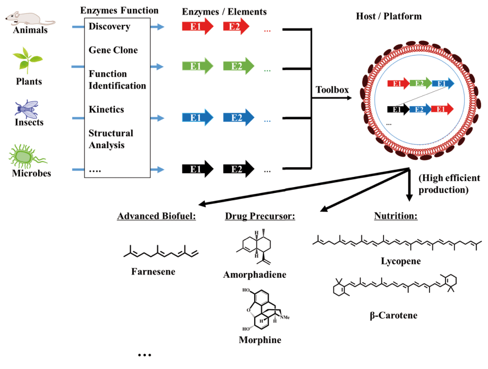 William Campbell, Satoshi Omura, and Tu Youyou jointly won the 2015 Nobel Prize in Medicine or Physiology for discovering the anti-parasite drugs avermectin and artemisinin. Natural products, obtained from bacterial, algal, fungal, plant, and animal sources, have provided humankind with powerful weapons to combat various diseases1,2. However, many active natural products, especially plant-derived drugs, have several disadvantages, such as low productivity and unstable source supplies. In 2013, artemisinic acid, a pharmaceutical precursor of artemisinin, which is a potent anti-malarial drug produced by the sweet wormwood plant Artemisia annua3, was first produced in an engineered Saccharomyces cerevisiae strain4. Semi-synthetic artemisinin is available on the market, and its production capacity is currently about 50–60 tons per year5,6. This work marks a milestone in synthetic biology. Very recently, well-known opioids have also been successfully biosynthesized in S. cerevisiae7; this is considered to be the most complicated and elaborate engineering work ever achieved in the field, and it is a remarkable landmark in the increasingly sophisticated use of synthetic biology to engineer complex metabolic pathways into microbes8.